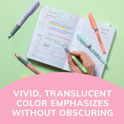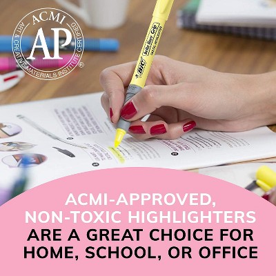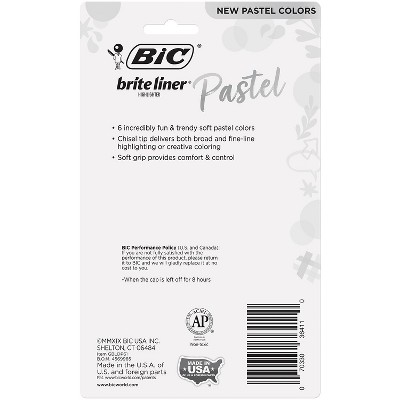 BIC Brite Liner Grip Highlighter, Chisel Tip (1.6 mm), Assorted Colors, For Broad Highlighting and Fine Underlining. BIC Brite Liner Grip Pastel Highlighters make staying organized fun! Each highlighter features a soft grip for added comfort and control and a chisel tip that lets you easily switch between broad highlighting and fine underlining. These assorted highlighters can be left uncapped for up to eight hours without drying out, and are ACMI-approved, non-toxic. The fun, trendy assortment of soft pastel ink colors in yellow, pink, blue, green, purple, and orange is a great choice for emphasizing information in your notes and documents. These highlighters are great for coloring, too!. One 6-count pack of BIC Brite Liner Grip Pastel Highlighters. Thin highlighters with a versatile chisel tip that creates both fine and broad lines. Each highlighter pen can write for up to 8 hours without a cap on and not dry out. Fits snugly in your hand with soft grips for added comfort and control. Pastel highlighter set featuring markers in six trendy colors: Orange, Yellow, Green, Blue, Purple and Pink (assortment may vary). Its water-based ink does not stain the paper, making it perfect for photocopies. ACMI approved non-toxic.