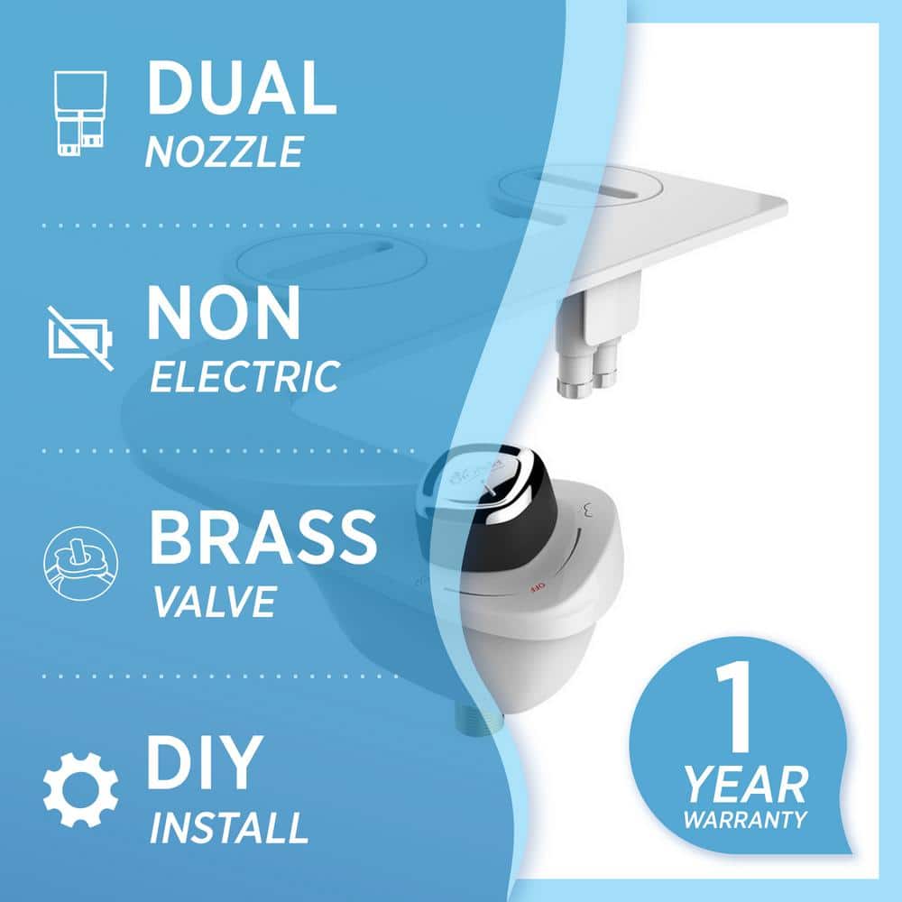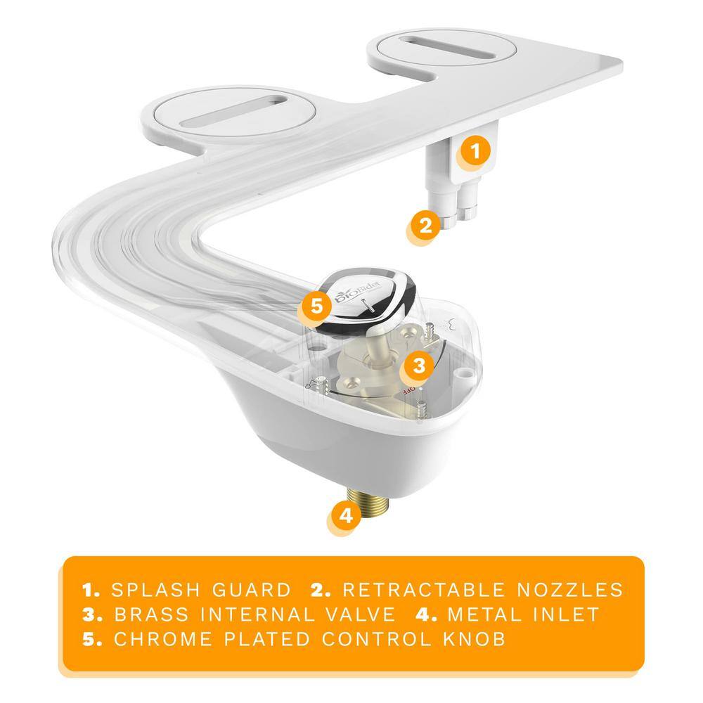 . Bidet Accessory Type: Attachable Bidet System. Color Family: White. Features: Adjustable Sprayer Settings,Adjustable Water Pressure,Feminine Wash,Posterior Wash,Thin Design. Included: Mounting Kit,Supply Lines,T Valve Connector. Product Weight (lb.): 4 lb. Style: Modern. Product Depth (in.): 15.5 in. Product Height (in.): 3.66 in. Product Width (in.): 12.3 in