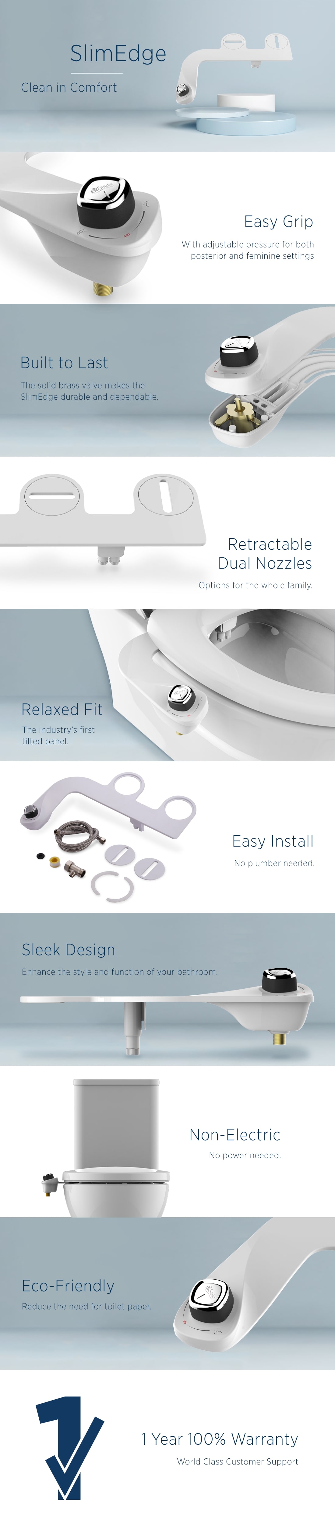 Redefine your bathroom experience with the new standard in bidet attachments. The SlimEdge features a sleek incline to complement your natural position. Control your clean with the comfort grip pressure control knob and dual nozzle cleansing options. Designed for an easy DIY install, there's no need to call a plumber. Simply place the attachment and connect directly to your fresh water supply with our provided quality brass adapter and braided metal hose. No wires. No extra plumbing. No hassle. Say goodbye to toilet paper, and say hello to a cleaner, healthier lifestyle.. Exclusive relax fit control panel & easy grip pressure dial. Silicone inserts in the mount keep the bidet from sliding. Easy DIY installation, no electricity needed. Exclusive relax fit. Non-electric bidet attachment. Dual nozzle spray. Unified brass valve. Ultra-thin construction. Double sided body. Adjustable water pressure. Positive Stepping Pressure Control technology. Universal brass T-valve included. Durable braided water hose included. Exclusive easy grip knob. Click Here to view Features & Benefits of this product.