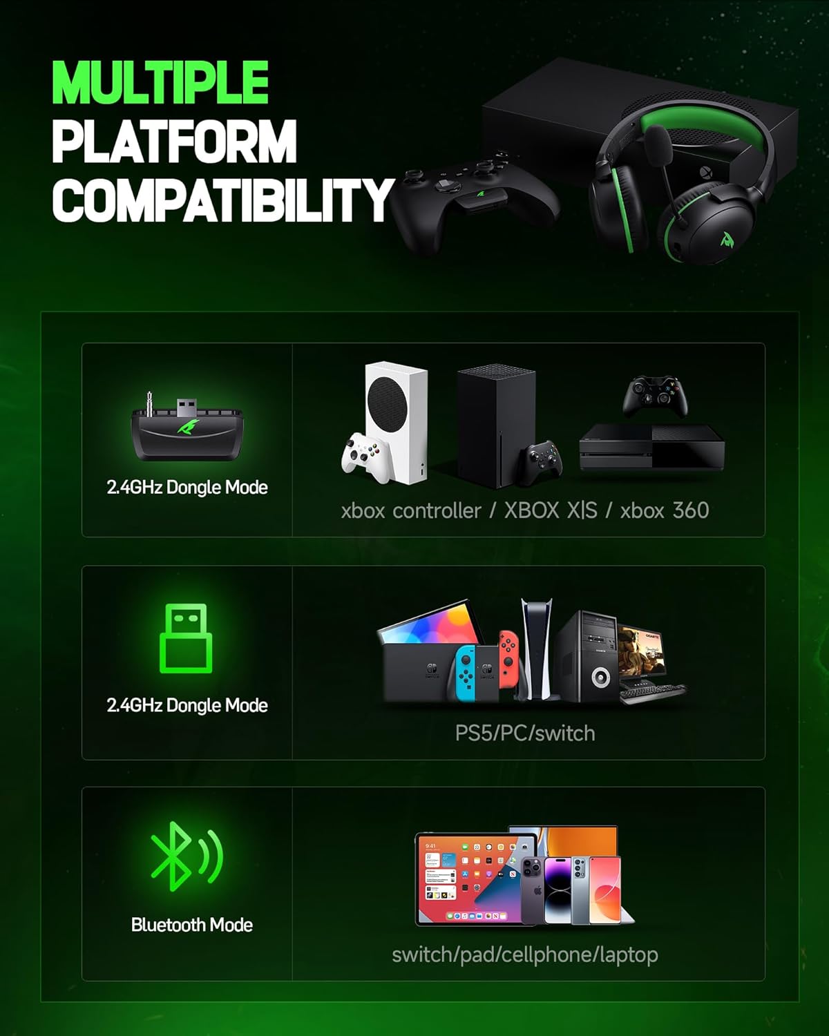 【Wireless Headset Designed For Xbox Series】KOFIRE wireless gaming headset is designed for Xbox Series X|S, Xbox One. KOFIRE Xbox headset's wireless connectivity is standout feature of this headset. The wireless technology ensures a stable and lag-free connection, allowing for seamless gameplay. The controls on the headset are intuitive and convenient. I can adjust volume, mute the microphone. By long-press mic button 3s to switch bluetooth mode and 2.4GHz dongle mode, you can easily balance game, listening to music or taking calls on mobile device.(NOTE:Only compatible with official Xbox controllers via USB dongle; not compatible with third-party controllers or Xbox native Bluetooth.)