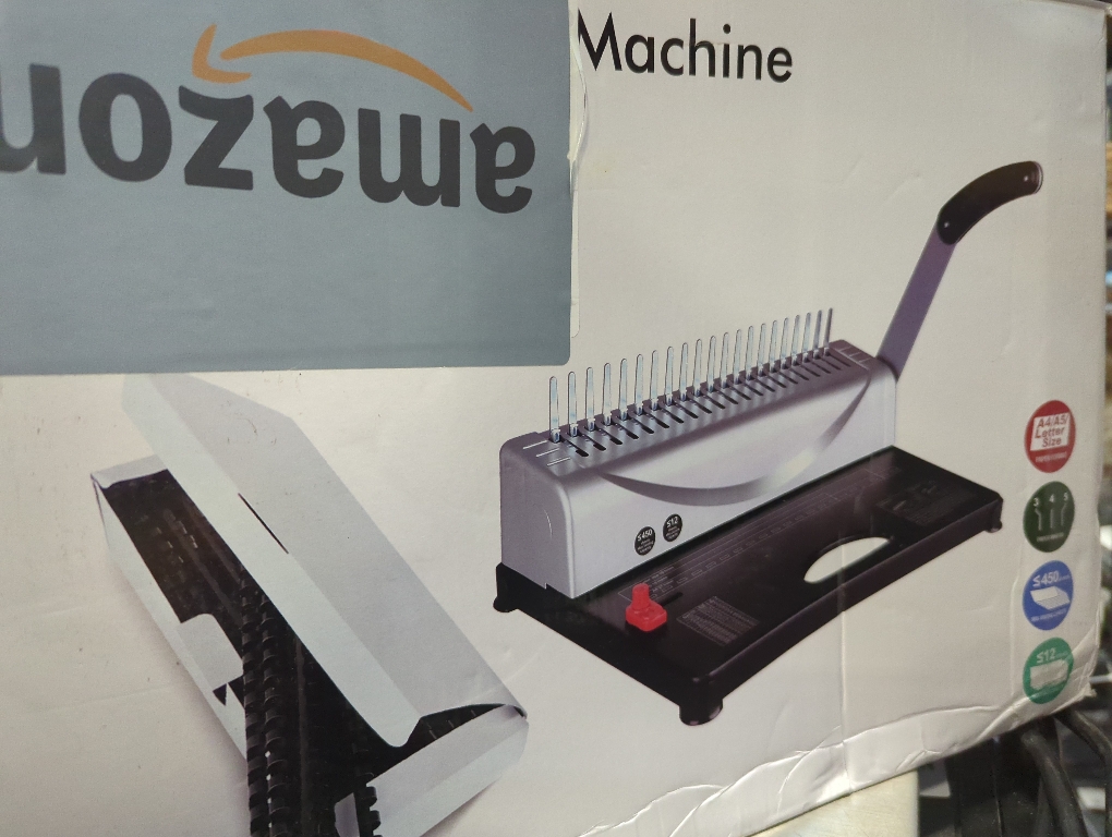 【Great Value for Money】Our binding machine comes with 1 Box of 3/8'' black PVC comb binding spines(for 50-60 sheets binding capacity) ➤Max binding capacity: 400 sheets of paper(with 2'' comb binding spines, not included in package). ➤Max punch capacity: 10-12 sheets of printing paper(paper thickness≤80g(20lb) ), 2 sheets of 230g(≤85lb) cover/textured paper, 1 sheet of 5-12mil PVC cover 【Humanized Design, Light but sturdy】Durable metal construction ensures long-lasting use. ➤Tips: ①This binding machine has an oiled cutting blade to protect the punch die from rusting. Notice: ②To avoid staining important documents when punching, please use test cardboard first to clean the blades. ③Before punching holes each time, please use tools such as an art knife to clean the paper scraps inside the hole punch 【Easy and Safe to Use】Manual punching and binding operation only require 2 steps, with a low force handle that simplifies punching and non-slip feet for stability. ➤TIPS: First of all, Please install the handle 90 degrees perpendicular to the tray, otherwise there is no way to activate the punch function; When pressing the handle to punch holes, please press the handle to the bottom in one go, DO NOT pause halfway, so as not to cause a paper jam 【Marks of A4/A5/Letter Size & Adjustable Edge Guide】Our upgraded comb binding machine is suitable for Letter Size (19 holes), A4 Size (21 holes), and A5 Size (15 holes), with an enhanced accuracy edge guide from 3mm to 5mm for pinpoint punching 【Strict Quality Control 】Every batch of our binding machine undergoes strict quality control and testing before packing.