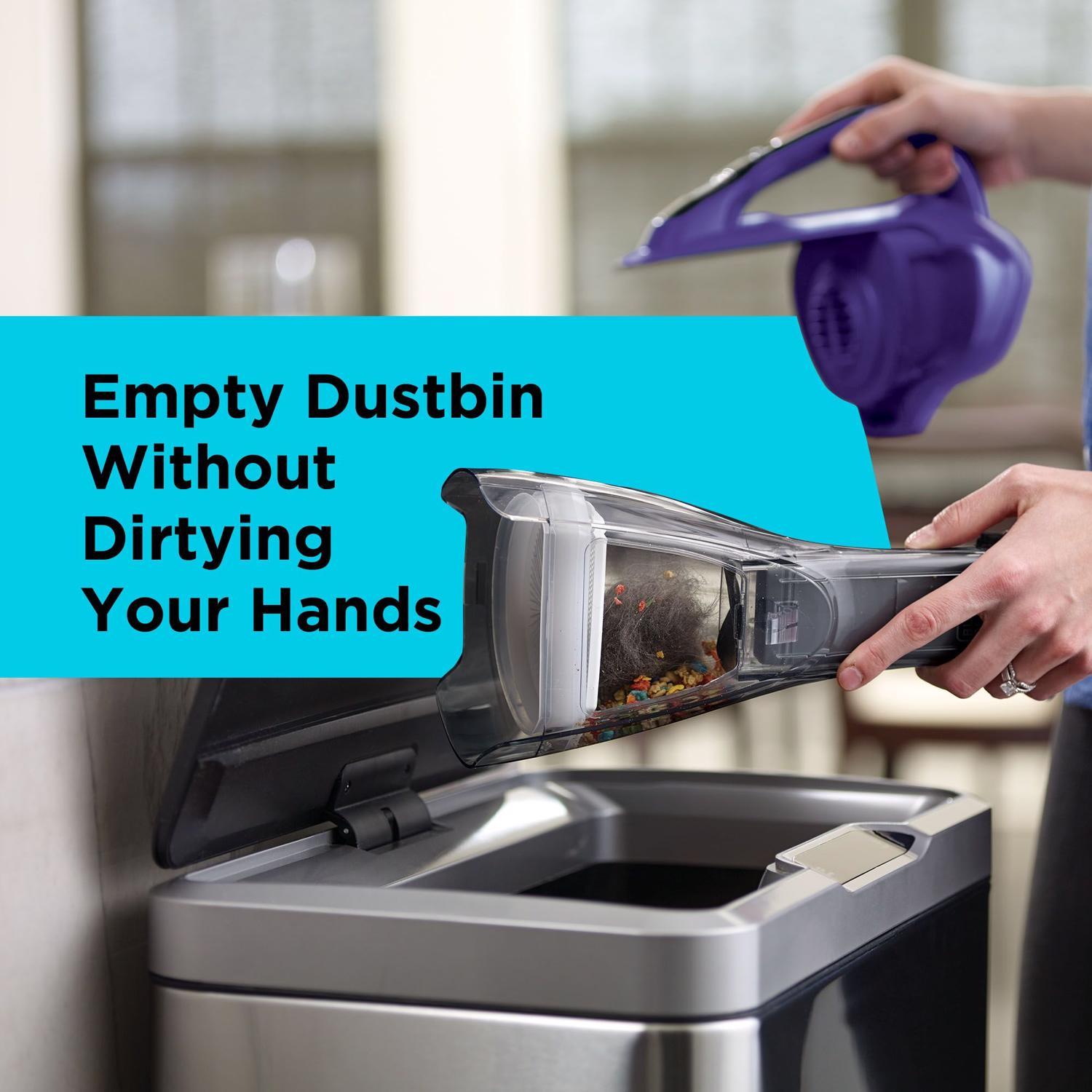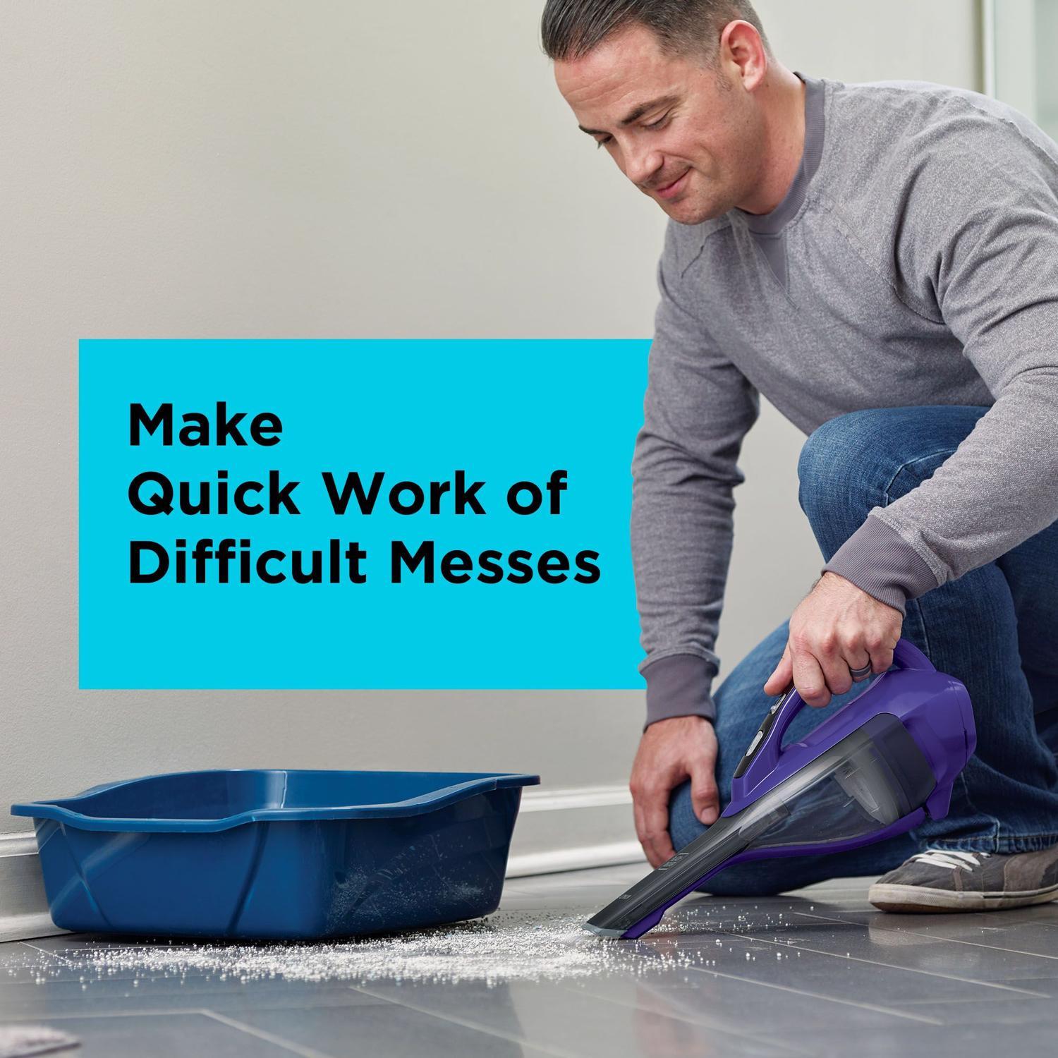 From the #1 Brand in hand vacuums, This hand vacuum comes with a motorized pet head that helps you pick up pet hair without it getting tangled in the brush. Lithium technology gives it powerful suction to help pick up even bigger messes like food and litter. Plus, its on-board crevice tool and push in brush give you a deeper level of clean. And, after cleaning, dump the dirt and hair without touching it with the no-mess.