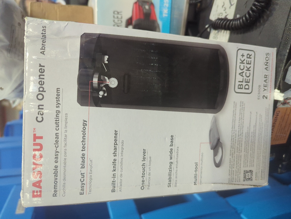 Simplify everyday kitchen tasks with the Black Decker EasyCut Extra-Tall Can Opener. The tall, wide design accommodates most can sizes and the EasyCut Blade Technology easily pierces cans for fast lid removal. The unit includes a built-in knife sharpener and a multi-tool that removes bottle caps and pop-tops. In one compact device you get: can opener, knife sharpener, bottle opener and pop-top remover.