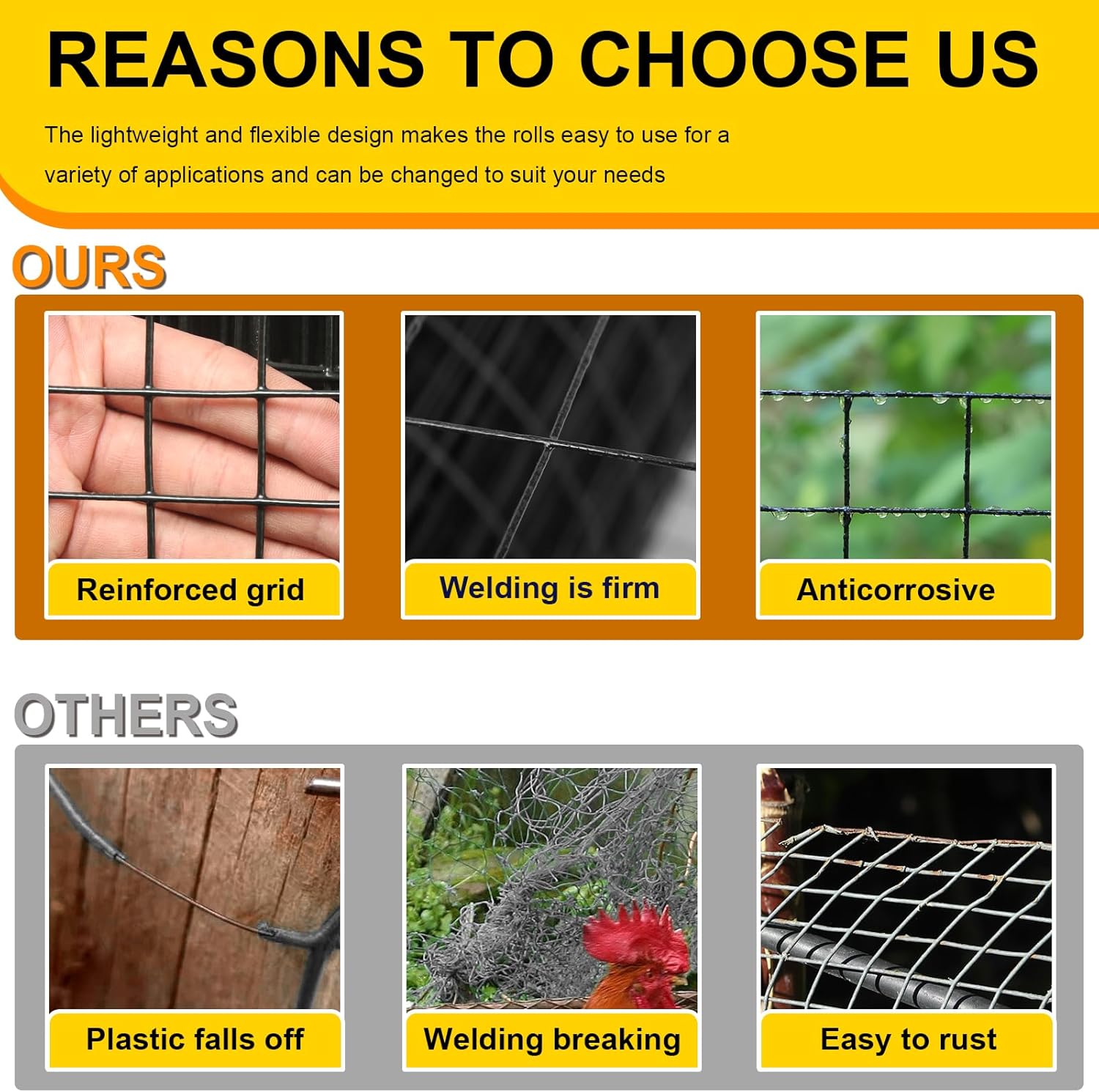 【Flexible & DIY-Friendly Welded Wire Fencing】 Lightweight, bendable, and easy to cut! Customize this welded wire mesh for chicken runs, garden borders, or crafts—sleek black finish adds style. Works as wire mesh fence, chicken wire roll, or floral chicken wire with zero hassle.