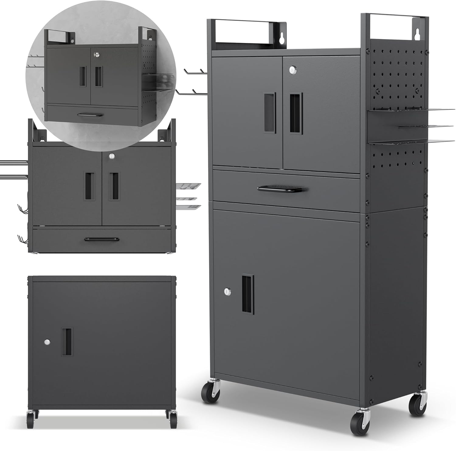 BLACK Heavy Duty 4-Tier Power Tool Organizer Wall Mount - Modular Drill Holder Wall Mount with Wheels, Lockable Doors - Versatile Shelf Rack Hanging Station, Tool Organizers and Storage for Garage