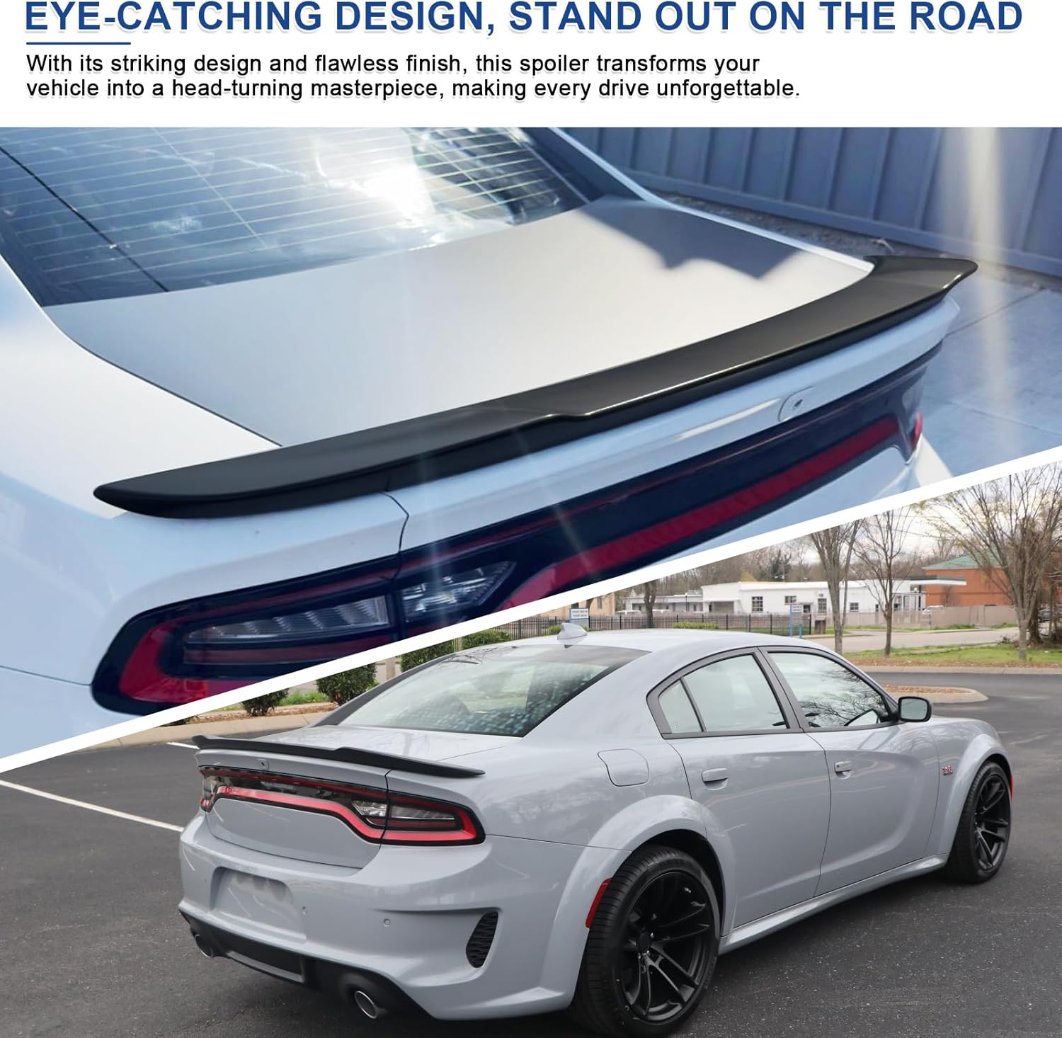 PERFECT FIT: This trunk spoiler is compatible with Dodge Charger all models with stock factory spoiler 2015 2016 2017 2018 2019 2020, Dodge Charger SRT SXT SE ScatPack Hellcat Daytona 2015 and up with a stock spoiler (NOTE: Not fit the 3 piece RT stock spoiler!!), designed from the original molding, perfectly fits the body curves of the Dodge Charger 2015-2023.