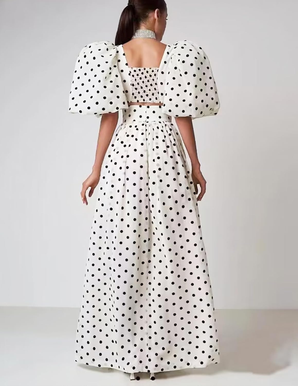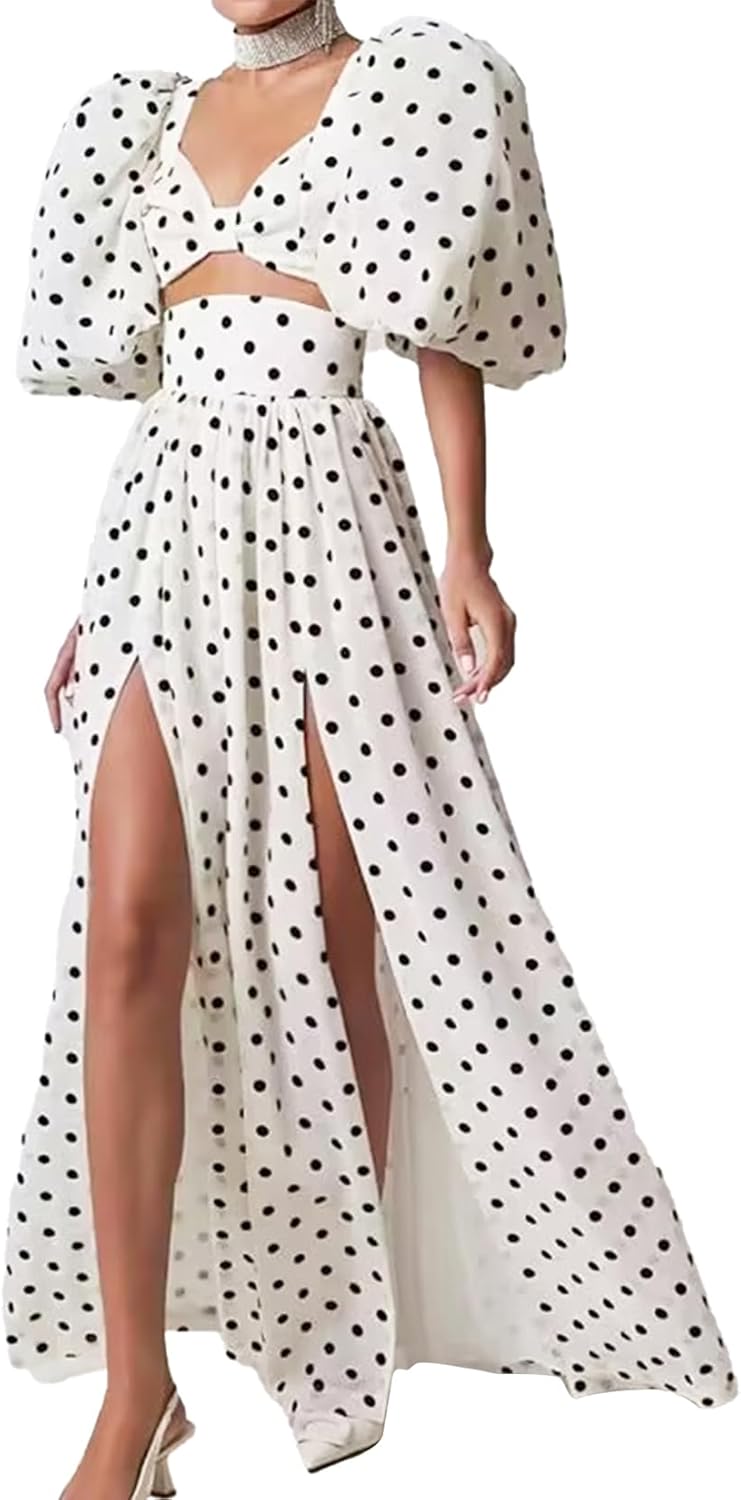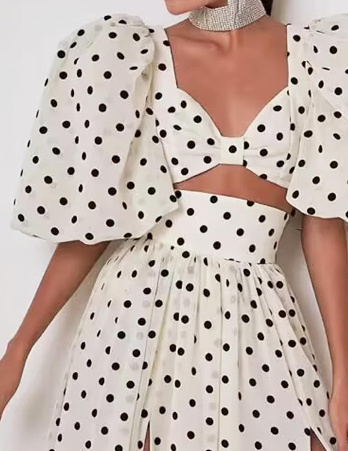 Design: The black dot dress combines modernity and sensuality through a high slit, strapless cutout and puffed sleeves. Perfect for formal parties, cocktail parties or evening dinners. Pair it with gold jewelry and brown heels for a stylish look.