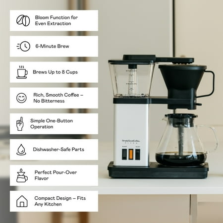 SimplyGood Stainless Steel 8-Cup Coffee Brewer Flavor: Our 1,560 Watt heater and high-quality precision components ensure perfect coffee brewing water temperature between 195-205°F. The Bloom setting automatically pre-infuses the ground coffee to deliver exceptional handcrafted pour-over quality flavor. The elegant glass carafe with mixing tube ensures the same coffee taste from the first to the last cup. Easy-to-use: Our 1-button operation makes this brewer fool-proof, ensuring perfect coffee every time. The easy-to-manage parts are dishwasher-safe for quick and convenient clean-up. Design: The brewer features a classic configuration, elegantly designed with black and brushed aluminum to complement your appliances and kitchen decor. It takes up minimal counter space for an 8-cup coffee maker, making it a stylish addition to your kitchen. Optimized Brewing: Brew 2 to 8 cups in just 4-6 minutes with the one-button operation, featuring a "Bloom" setting for enhanced pour-over flavor. Superior Design: Elegant stainless steel construction with dishwasher-safe parts, maintaining perfect brewing temperatures for a rich, bitterness-free coffee experience.