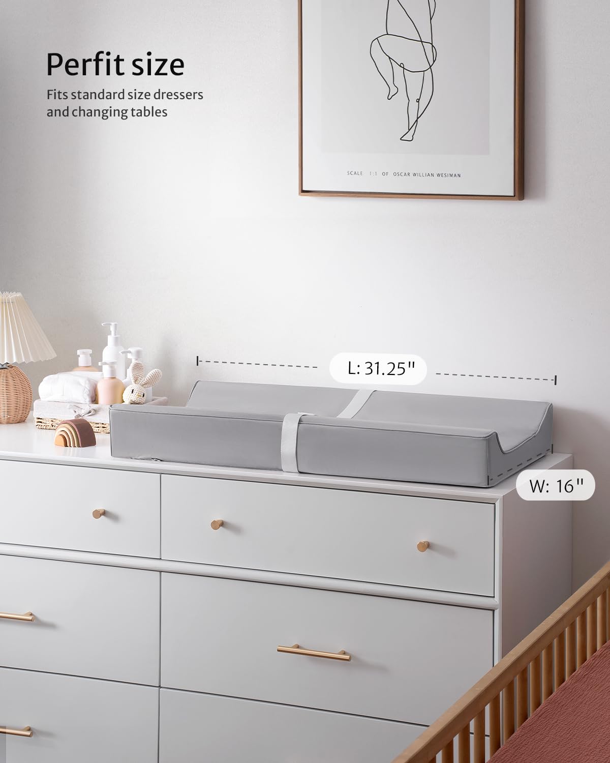 Perfect Size - The baby changing pad size at 31.25"L * 16"W * 4.25"H, fits all standard changing tables and most dressers. With lightweight styling, it's convenient for on-the-go traveling, daycare and more