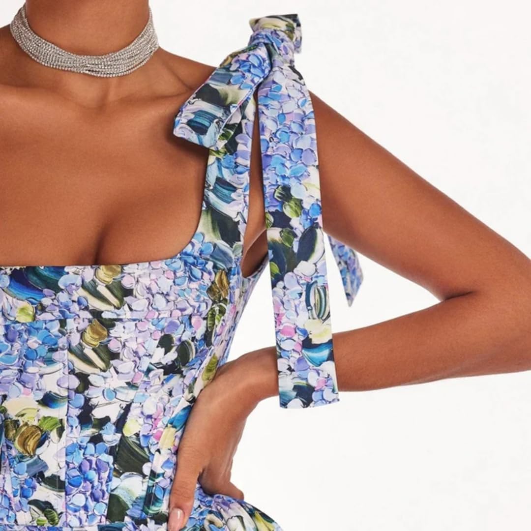 Blue Medium Women Floral Print Square Collar Lace-up Sling Long Backless Hollow Boho Hem Maxi Dress
