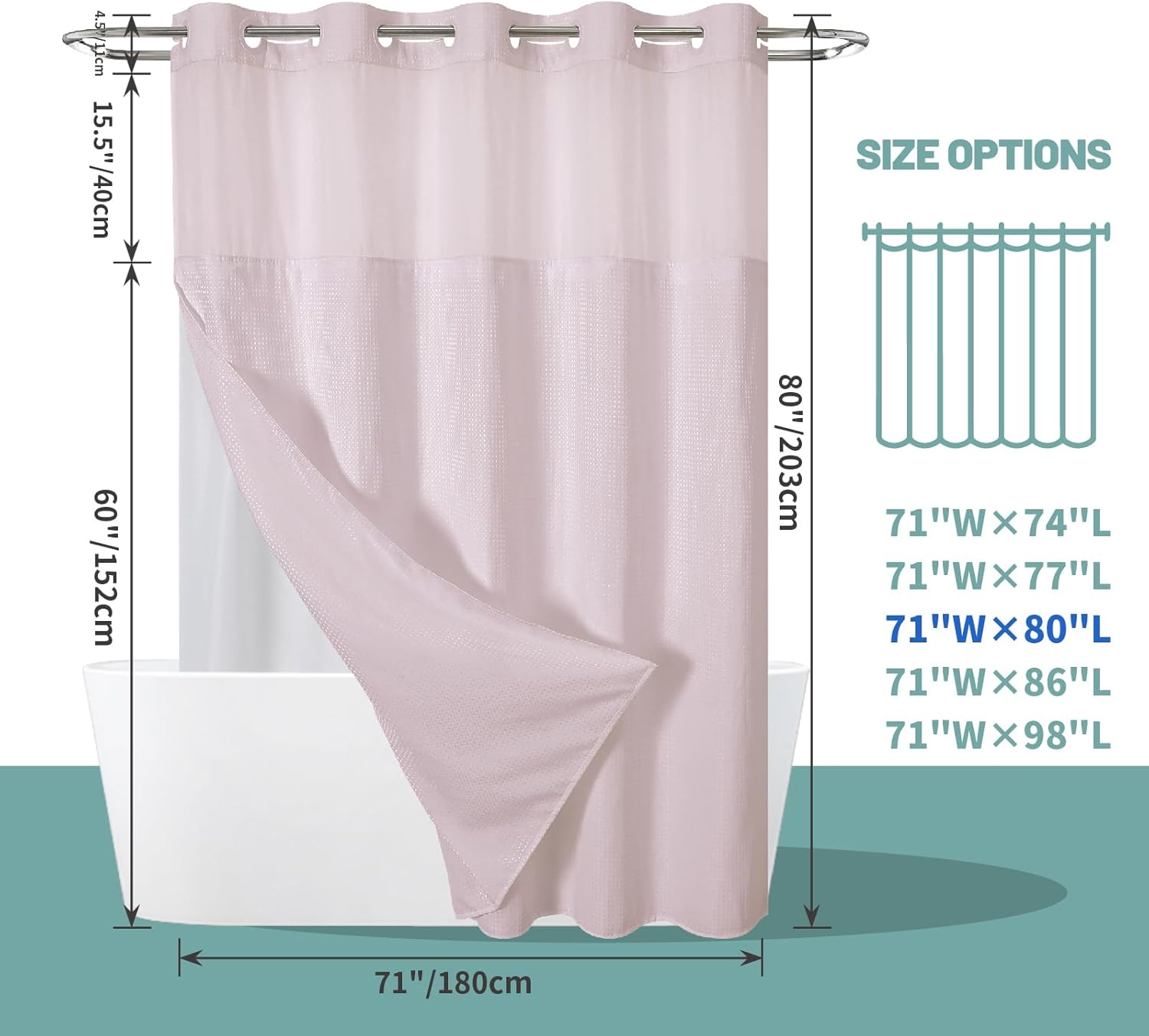 BlushPink Long No Hook Waffle Weave Shower Curtain with snap-in Liner Replacement, 230GSM Waterproof Fabric Hotel Shower Curtain Set for Bathroom, Through Mesh Top Window,71Wx80H