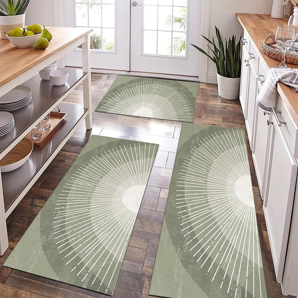 Boho Kitchen Mat Set of 3,Sage Green Sun Sunrise Print Abstract Kitchen Rugs and Mats Non Skid Washable Rugs,Modern Farmhouse Runner Rugs with Rubber Backing for Kitchen Decor Accessories