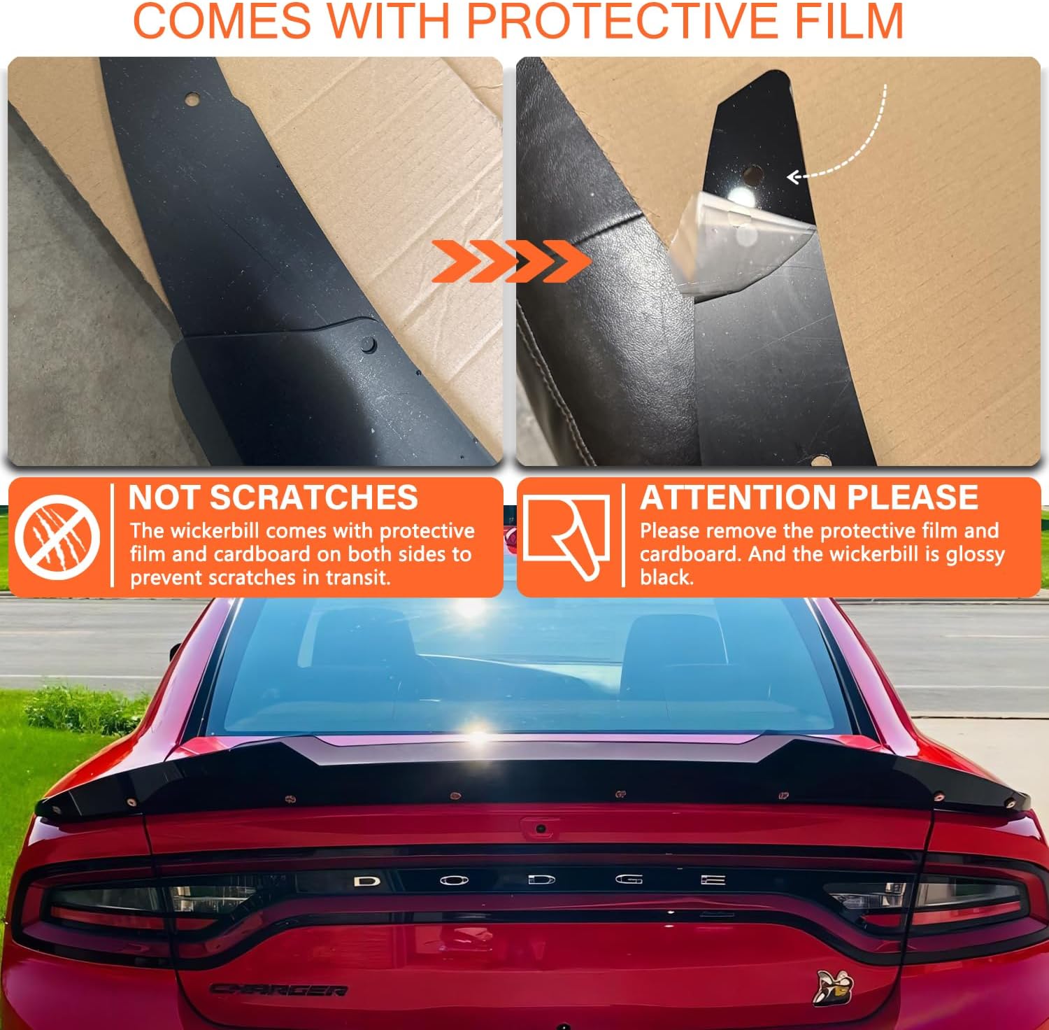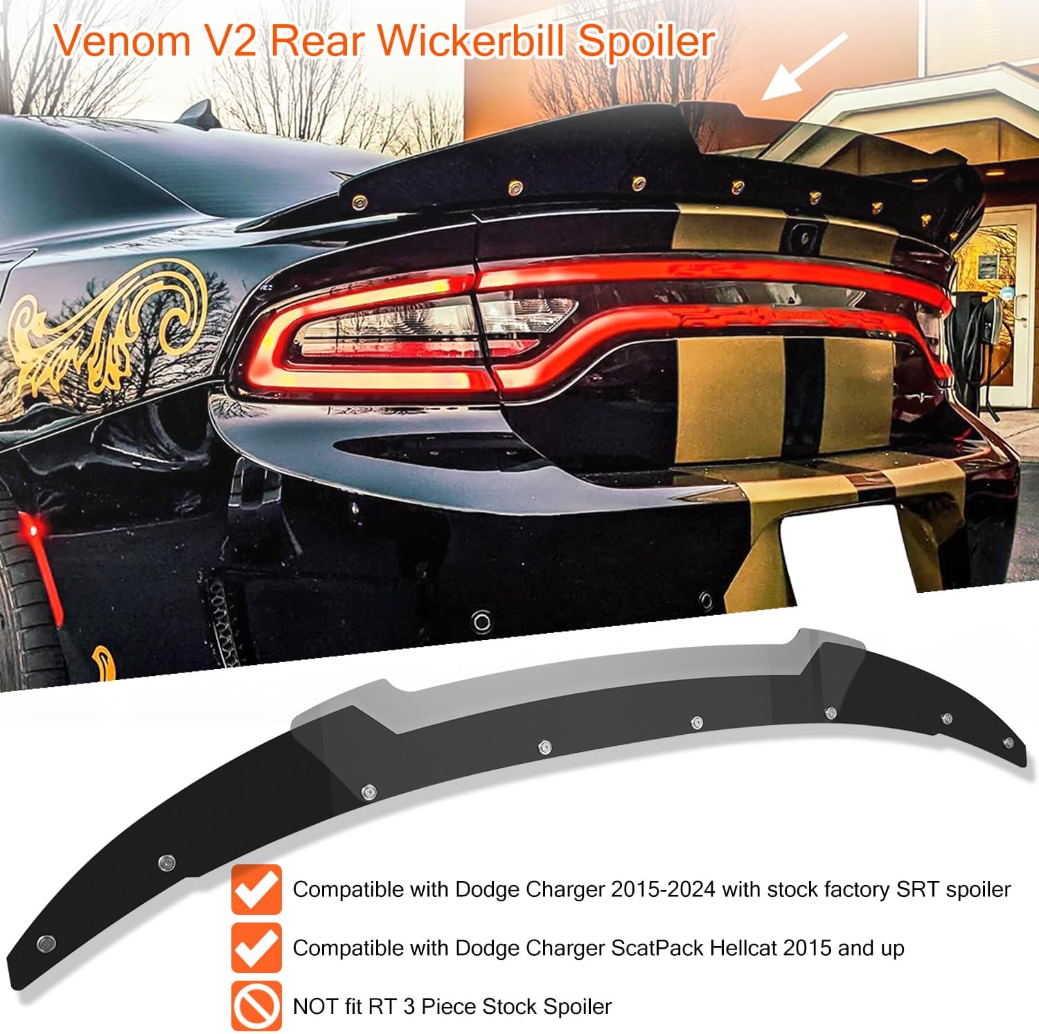 【Perfect Fitment】 This rear wickerbill spoiler is compatible with Dodge Charger 2015 2016 2017 2018 2019 2020 2021 2022 2023 2024 with stock factory SRT spoiler. Also fits for Dodge Charger ScatPack Hellcat 2015 and up. Highly accurate model designs to ensure exact fitment. Will NOT fit RT 3 Piece Stock Spoiler.