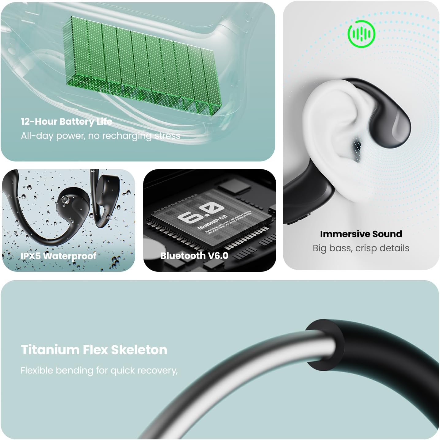 Next-Gen Bluetooth V6.0 & Battery Performance:Ditch lag and dropouts for good! These Bluetooth bone conduction headphones harness the latest Bluetooth V6.0 tech to pair in a blink—faster than tying your shoelaces. Whether weaving through city crowds or scaling mountain trails, the rock-solid connection stays unbroken. A 220mAh super battery serves up 12 hours of non-stop beats—while a 10-minute quick charge fuels 1 hour of intense workouts. Fully recharges in 1.5 hours