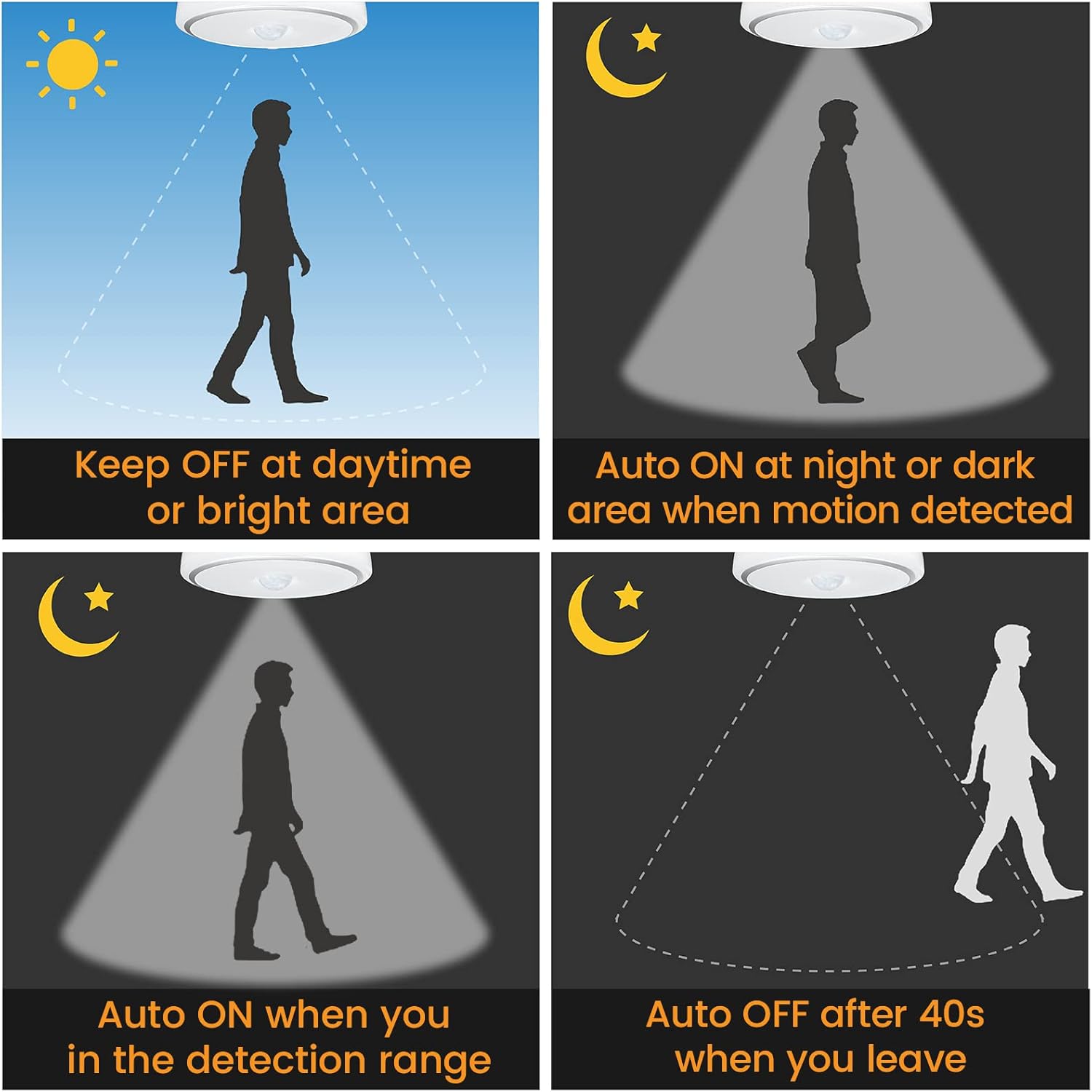 【Dusk To Dawn】Built-in light sensor device, our motion detector ceiling light can detect daytime and night automatically. It will standby during the daytime and detect at night, that means the light will not light up in the daytime even with motion.