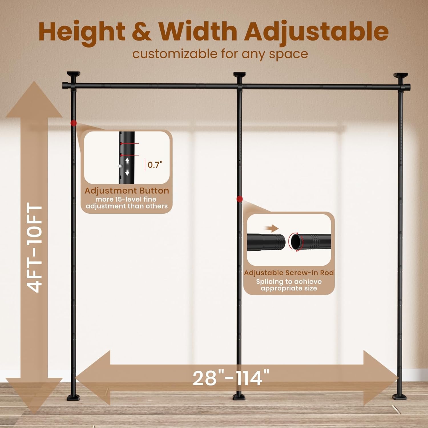 【Adjustable Height & Width Easily】 This partition room dividers are adjustable in width (28"-114") and height (4 -10 ft) to match any space. Both vertical and horizontal poles can extend or retract by 14.2 inches with the addition or removal of splice B ploes. This feature allows you to flexibly customize your own space and provides greater stability