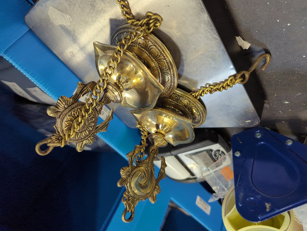 New open for inspection...Set of 2 Brass sangh and chakr Diya Wall Hanging with base stand and 1 wick for diya lighting