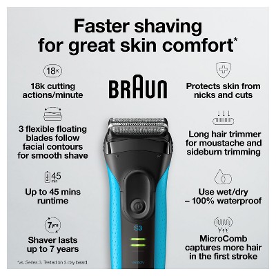 Tough on beards and smooth on the skin, Braun Series 3 ProSkin Electric Shavers for men provide a close shave and perfect skin comfort. MicroComb technology features two rows of fine, evenly spaced grooves surrounding an independently moving middle trimmer to catch and feed more hair for a faster shave*. The 3-Flex head on this electric shaver uses three pressure-sensitive shaving elements that automatically retract to protect your skin and adapt perfectly to facial contours for a close and gentle shave. Plus, this electric razor is equipped with a precision beard trimmer that slides out of the back for easy and more accurate mustache and sideburn shaping. This wet and dry foil shaver is 100% waterproof and can be used with foam, gel or even under the shower. Plus you can conveniently rinse the face and beard shaver under running water for easy cleaning. These rechargeable shavers for men include two powerful NiMH batteries with quick charge technology to provide a full shave after only one 5-minute quick charge. All Series 3 ProSkin electric razors for men are made in Germany with premium craftsmanship. *compared to Braun series 3, tested on 3-day beards