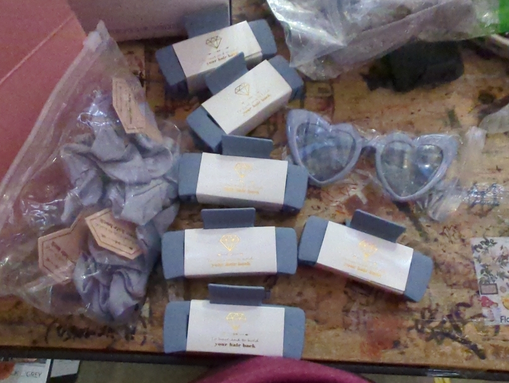 High quality Hair Claws clips and Scrunchies with diamond card"to have and to hold Your Hair Back" Let every bridesmaid enjoy the fun of unpacking,Exquisite bronzing decorative cards is very cute!Bridesmaid sunglasses make of High quality PVC production,These can use as cute Decorative wear and bachelorette party sunglasses photography props,A cute & fun addition to the bachelorette bags and box!
