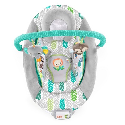 Jump straight into the jungle with the Jungle Vines cradling bouncer from Bright Starts. Made with plush fabrics, this is the snuggliest bouncer for a baby boy or girl. The deep cradling seat keeps baby secure, and the removable headrest adds a cuddly cushion for your little one’s head. Non-slip feet and a 3-point harness make this baby bouncer wiggle-proof for every wild child. Baby’s soon-to-be favorite seat is surrounded by the Taggies babies just love to touch! Hanging from the toy bar baby will discover two plush animal pals. When the adventure’s just about over, soothing motions, melodies and vibrations will tame your little lion.