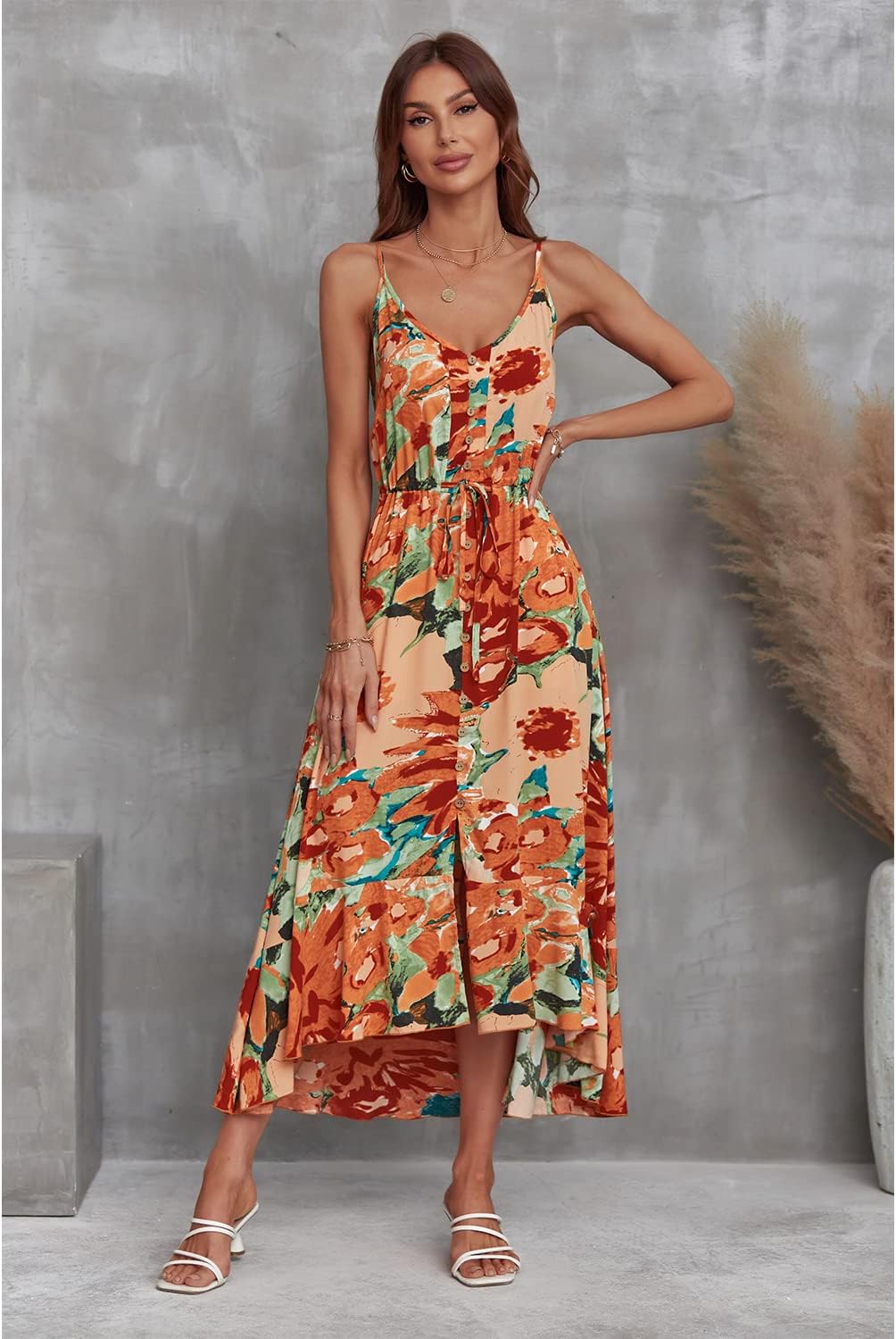BROVAVE Women's 2025 Summer Casual Boho Sundress Polka Dot Spaghetti Strap V Neck Flowy Midi Dresses (SIZE SMALL)