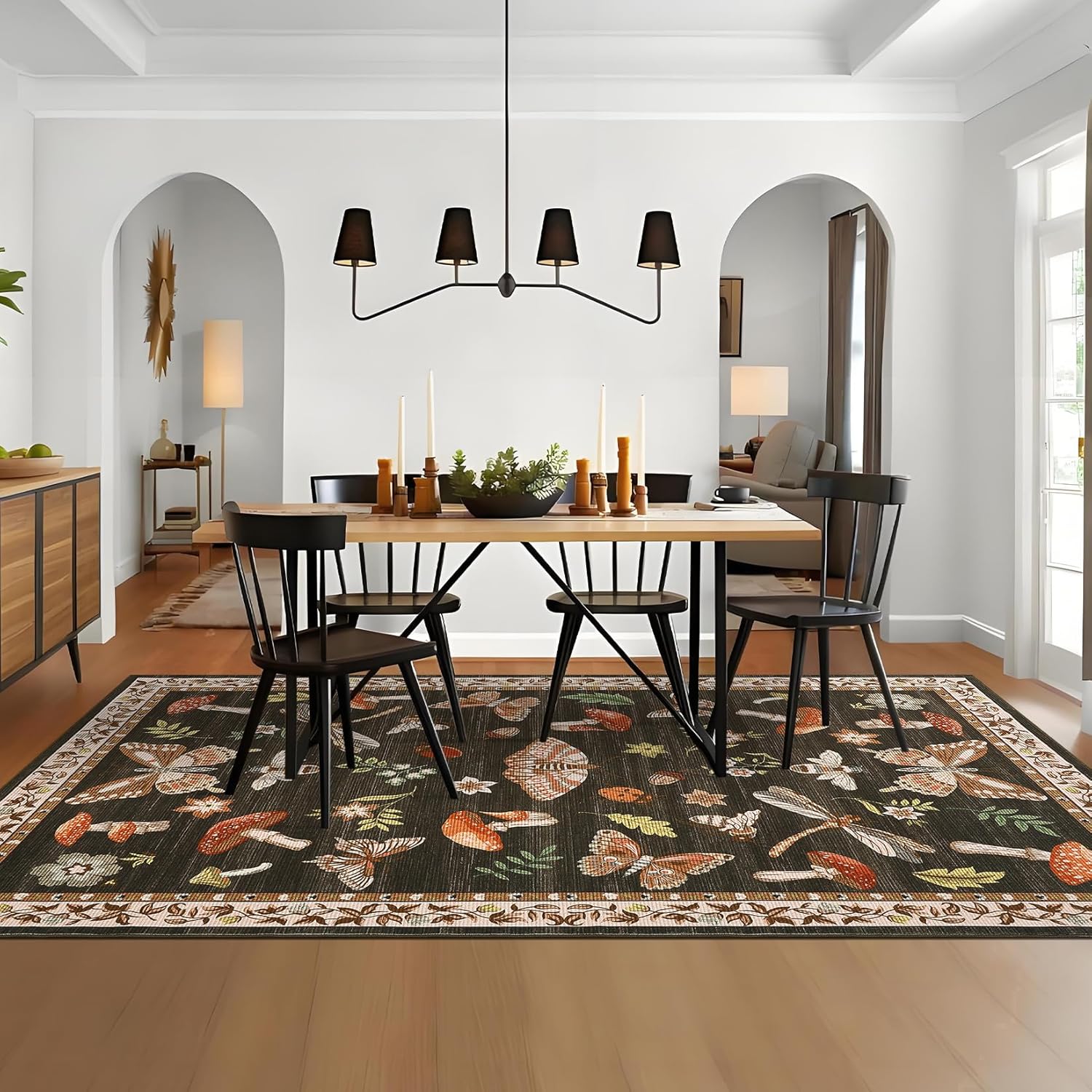 BROWN AND PINK MUTICOLOR Mushroom 10x13 Area Rug for Living Room Washable Non Slip Forest Soft Low-Pile Stain Resistant Thin Large Throw Carpet for Bedroom Dining Room Office Brown