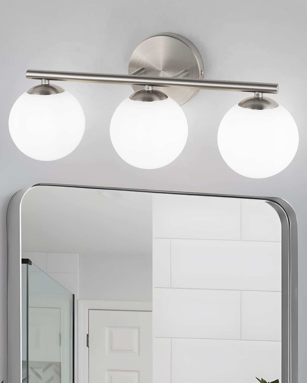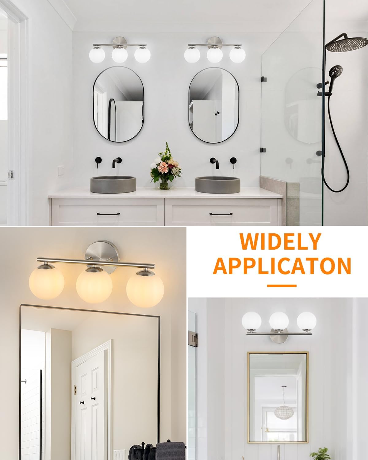 【Durable & Modern Design】The globe vanity light is paired with classic brushed nickel colors, complemented by milky white plastic lampshades(plastic glass mixed material, new material, not easily broken), creating a modern and minimalist style, fog-proof, anti-corrosion, moisture-proof, anti-rust and won't fade