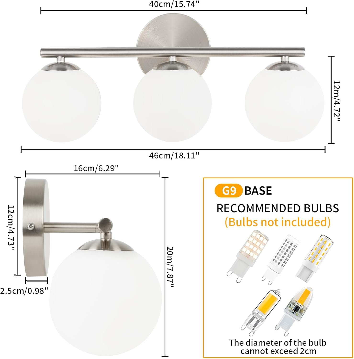 【G9 Bulbs Required】The bathroom vanity light need 3*G9 bulbs(Single Max 10W LED), works with LED, CFL, incandescent bulb, Edison bulbs.The brushed nickel vanity light can be used with the dimmable switch and dimmable bulbs, and creates a warm atmosphere. (Bulbs and switch are NOT included)