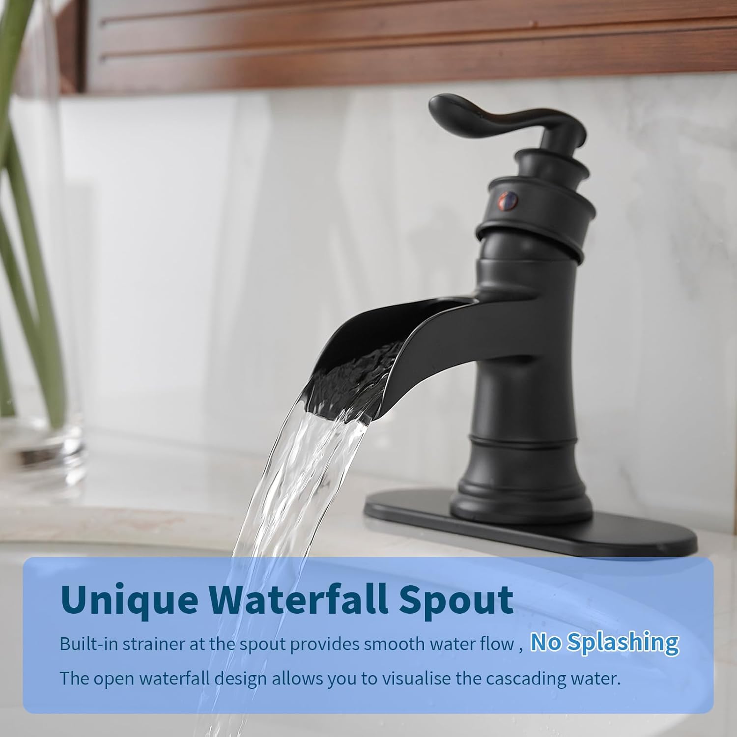 Single Handle Faucet: Black waterfall bathroom faucet for easy adjustments to a powerful waterfall stream.