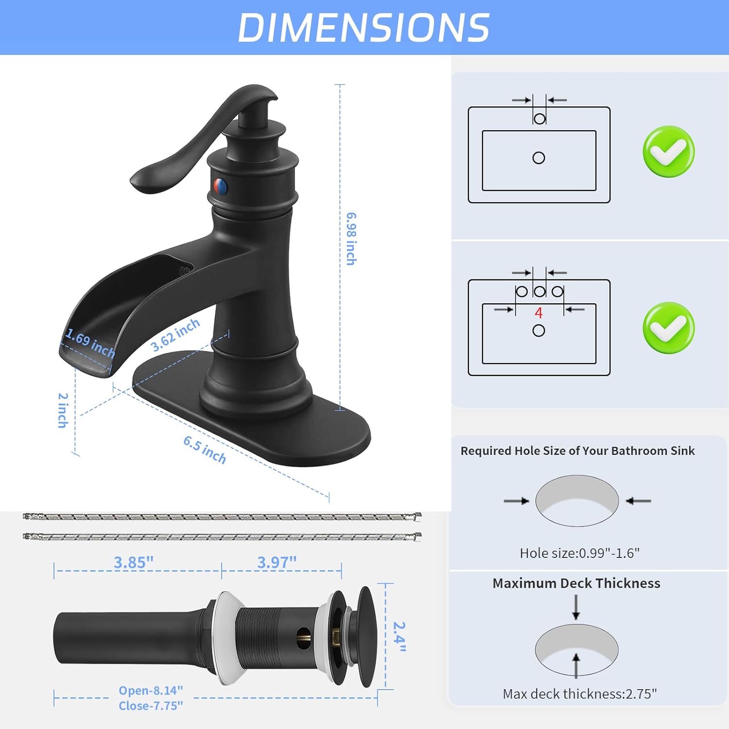 Finish: Matte black finish creates an antique look adds a touch of solemn elegance to any room. From its durable, long-lasting construction to the contemporary and decor-complementing design, this bathroom faucet waterfall belongs in your bathroom. It is compatible with 1 or 3-Hole installation.