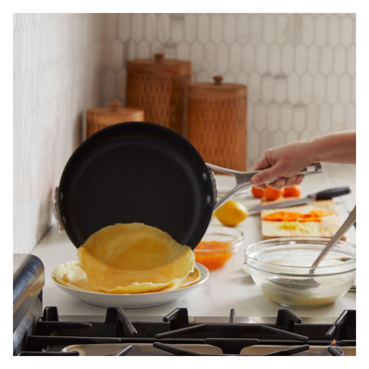 - Metal-utensil-safe with a long-lasting, 3-layer nonstick interior