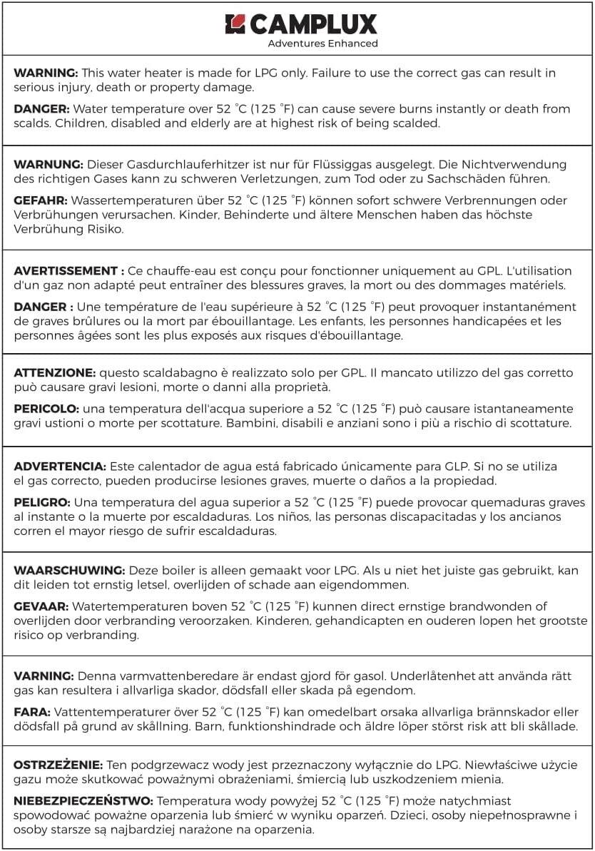Installation Instruction & Package Content: This Camplux AY132 heater comes with 5 feet premium on/off shower head, 5 feet gas regulator, 1 set US-standard garden hose, and 1 installation hardware pack. Setting up this propane water heater simply takes 10 minutes.