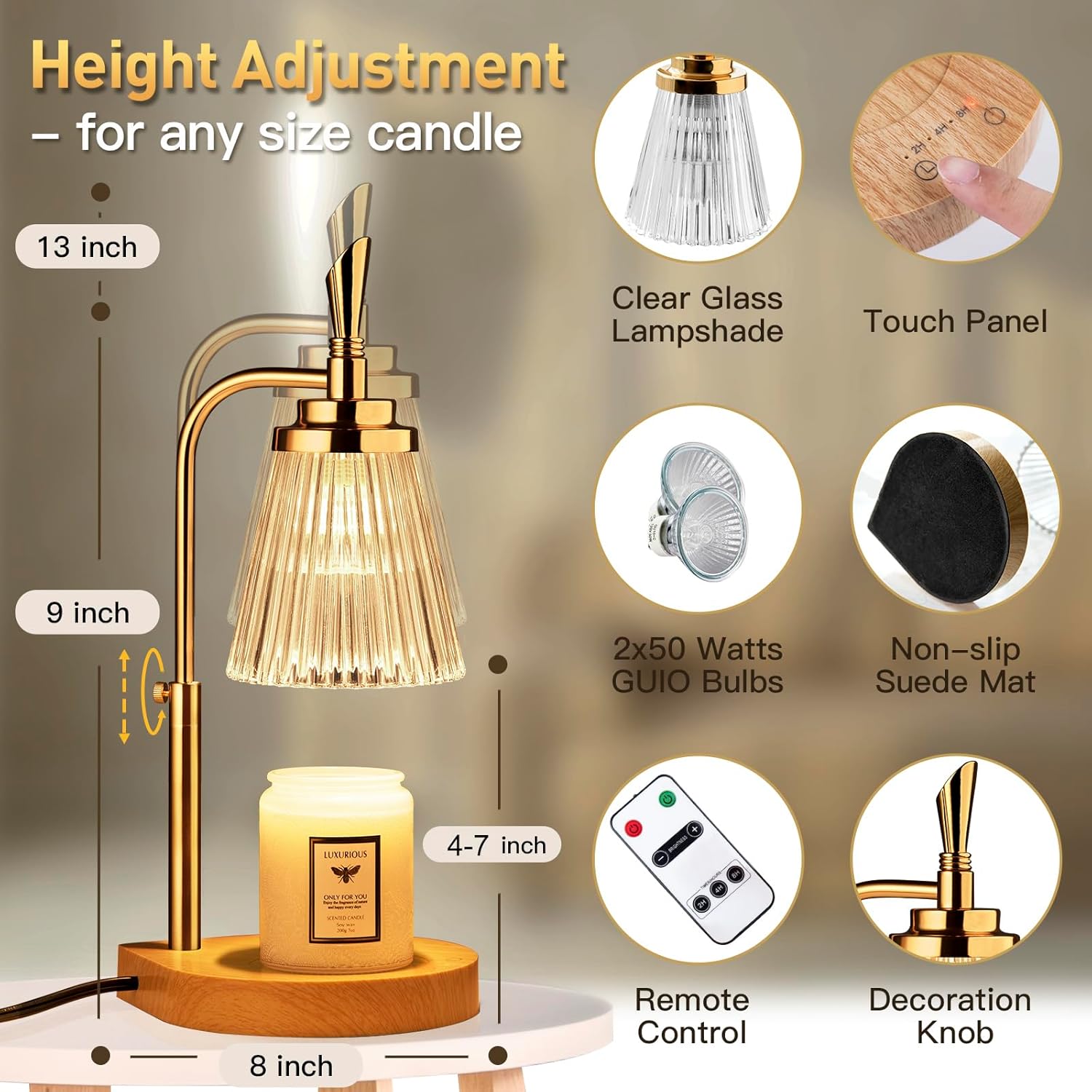 Candle Warmer Lamp, Remote Control & Touch Control Candle Warmer with 2-4-8H Timer and 4-Levels Dimmable Height Adjustable with 2 Bulbs Candle Lamp Warmer