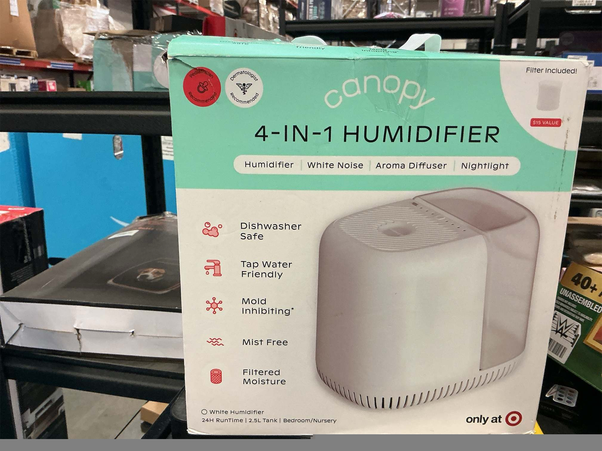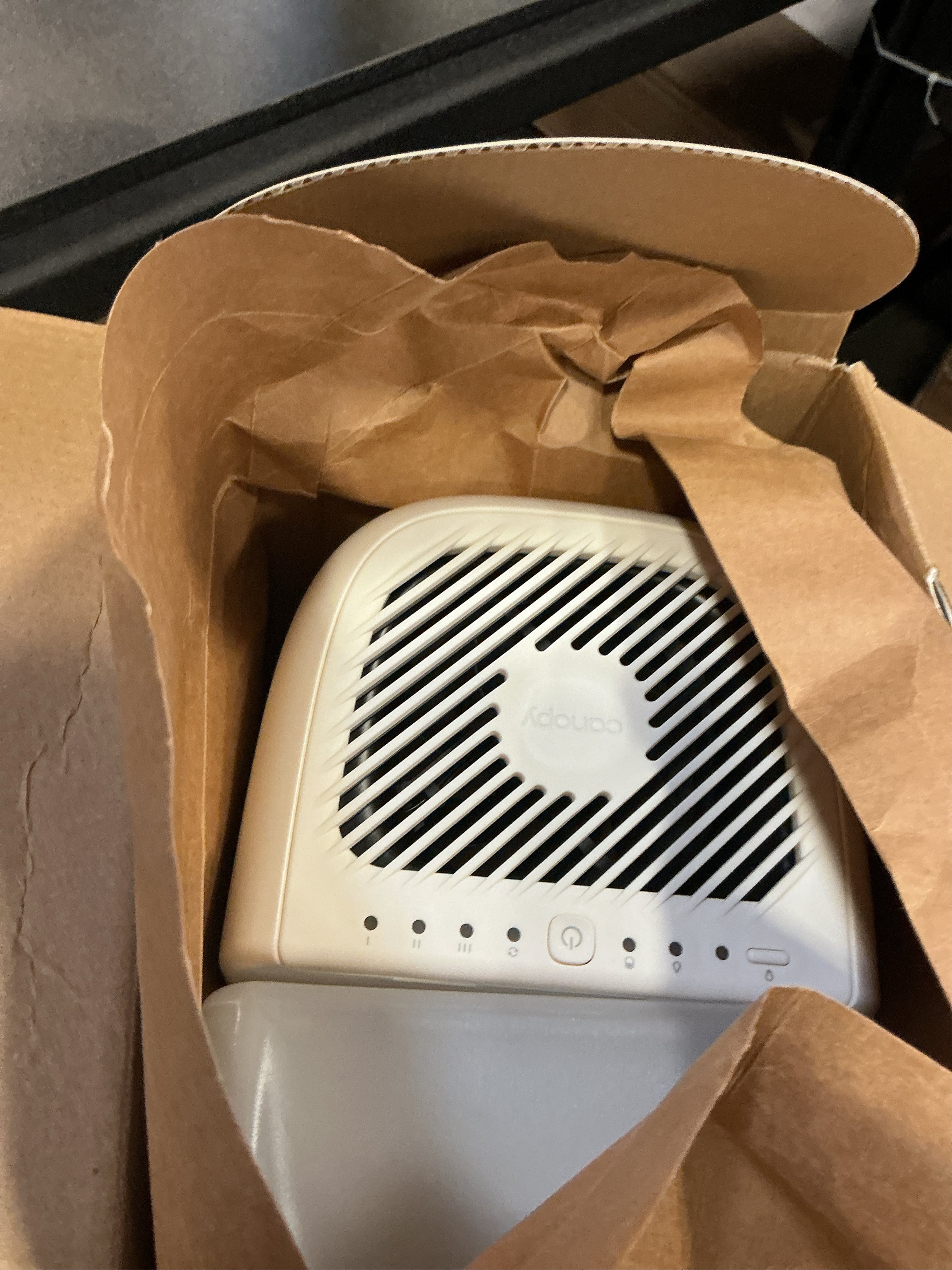 THE NEW AND IMPROVED BEDSIDE HUMIDIFIER 2.0: The new Canopy Bedside Humidifier has arrived. With an updated proprietary filter, larger quieter fan system, white noise setting, sleep and reading lights, stronger aroma diffusion and an updated design - The Bedside Humidifier is the perfect 2.5L humidifier for your bedroom, living room or office space. UNIQUE MOLD-INHIBITING TECHNOLOGY: Smart Persistent Airflow - Smart sensors inhibit mold growth and ensure the humidifier runs until completely dry. Our proprietary filter is custom designed with pre-filter that catches contaminants from the air and antimicrobial filter core helping catch metals, minerals, and dust before evaporation. Water passes through built-in UV technology before it is evaporated into the air. DISHWASHER SAFE PARTS AND RUN TIME OF 36 HOURS: Easy and functional - the tank, tray, grill, spacer, and cap can be placed directly in the dishwasher. The large tank opening allows for easy cleaning. Canopy's unique technology uses smart sensors to keep the humidifier running until no water is left in the unit. No water left behind limits opportunity for unwanted build up. As well, Canopy Humidifiers can run up to 36 hours on a full tank. THE HEALTH BENEFITS OF HUMIDITY: The Canopy Humidifier helps optimize your living space to have the ideal level of humidity. Ensuring proper humidity helps to hydrate skin; combating dryness, dullness and fine lines & wrinkles. Increased skin barrier function to protect from pollution. Alleviate cough, nasal congestion and other symptoms of cold, flu and allergies. Provide clean and safe aroma diffusion for a calming environment.