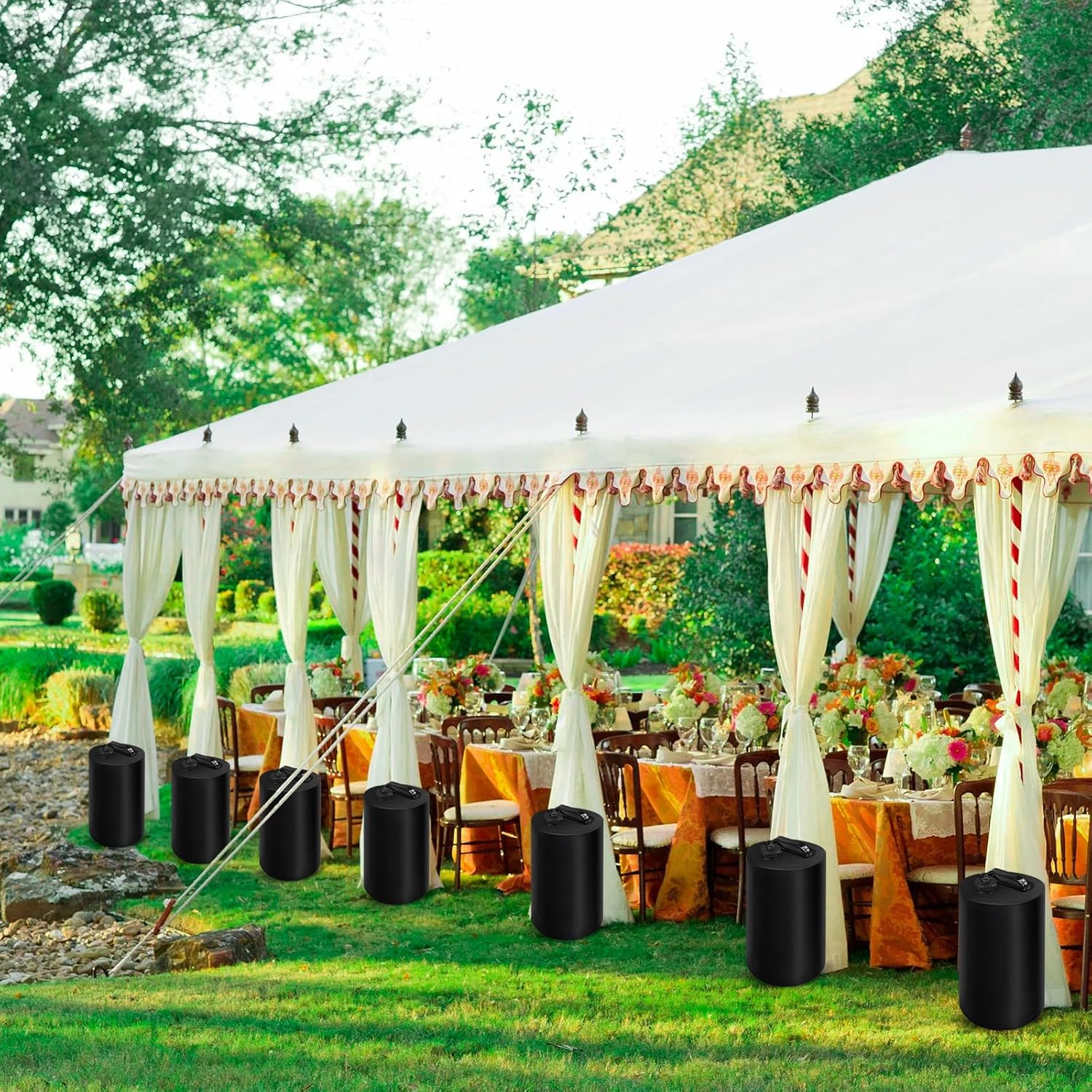 ???????????????????????? ???????????????????????????????? ???????????? ???????????????? ???????? ????????????: Each water weights for canopy tent legs can hold up to 44lbs of water, offering sufficient weight to keep your tent anchored securely. Simply fill the gazebo weights with water, then use the specially designed straps to secure it to the tent legs or upper trusses