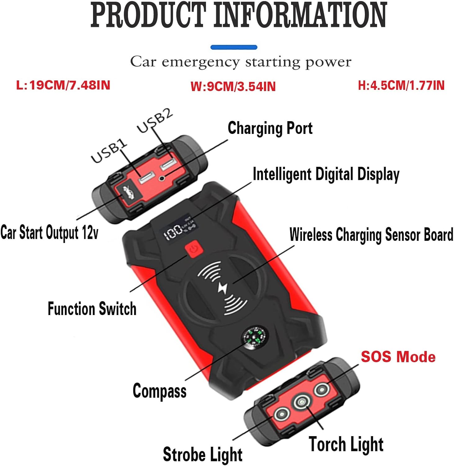 [Emergency lighting]: This emergency start power supply has a super bright LED flashlight and supports 4 LED lighting modes: light mode, flash mode, SOS mode, and warning light mode. It can be used as a flashlight, a life-saving signal light, as well as a must-have for camping and hiking at night.
