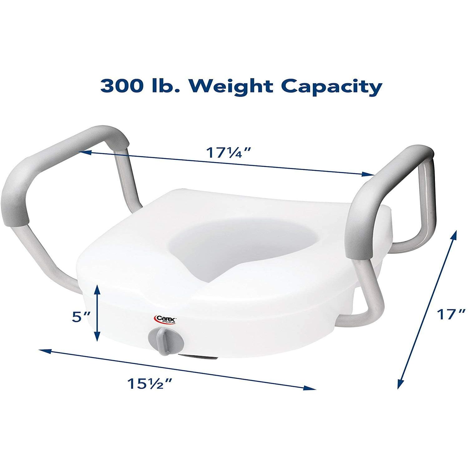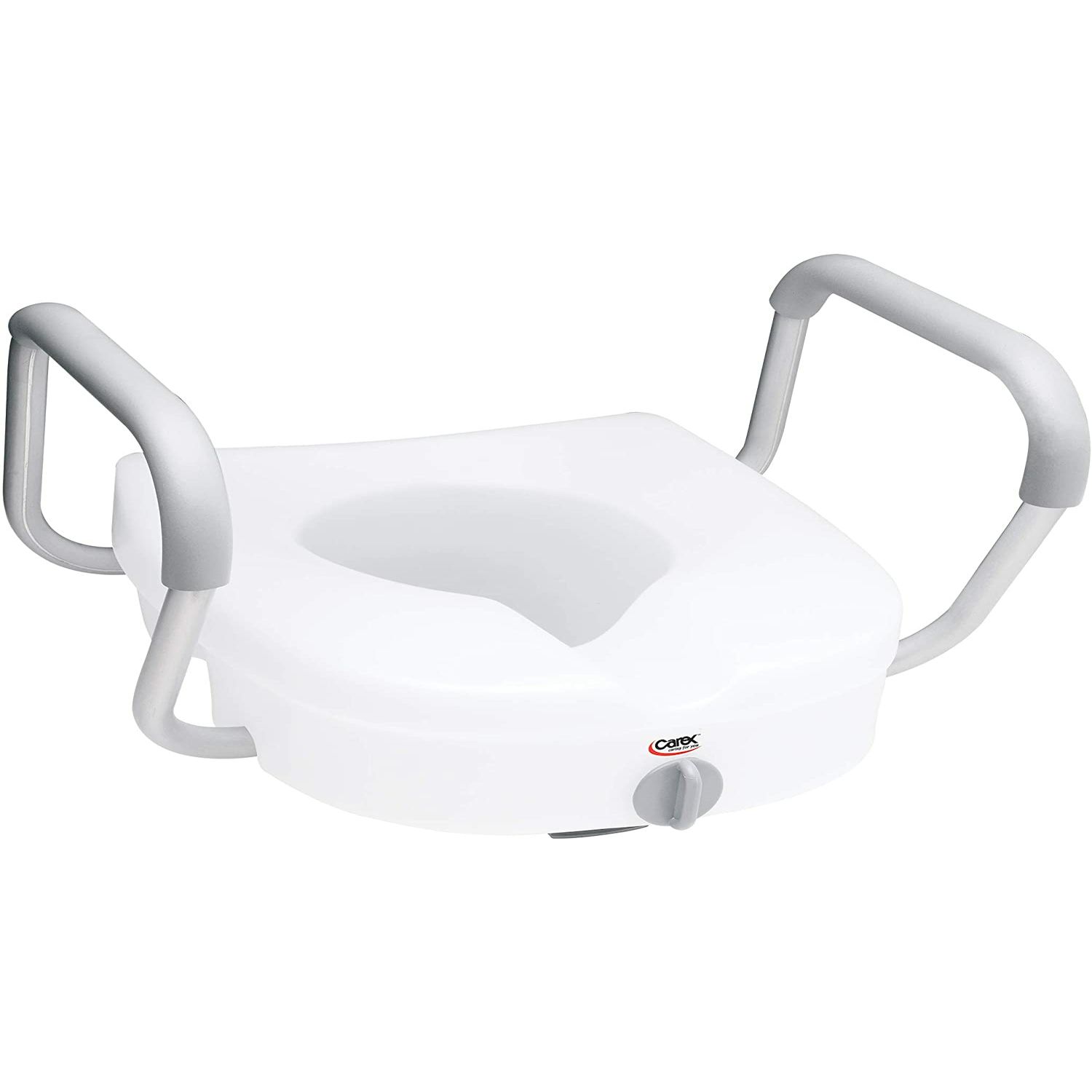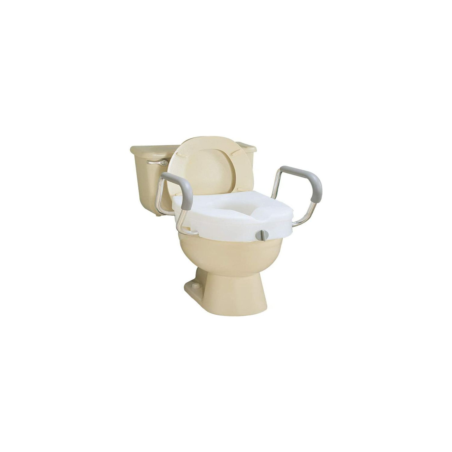A raised toilet seat with handles that assists those with bending or sitting difficulties. The easy-to-use locking mechanism secures the raised toilet seat to the toilet bowl. Toilet seat riser comes with padded armrests. The smooth contour seat has built-in hand grips for easy handling and is lightweight and easy to clean. There are endless uses for our raised toilet seats for elderly, handicap, and disabled including. Secures to round, standard, and elongated toilets. Adds 5 inches of toilet lift to toilets. A toilet seat riser with arms. Arm width adjustable between 18 and 20. Very stable and secure. Easy installation. Very comfortable. Click ADD TO CART now to get a high quality raised toilet seat with handles.