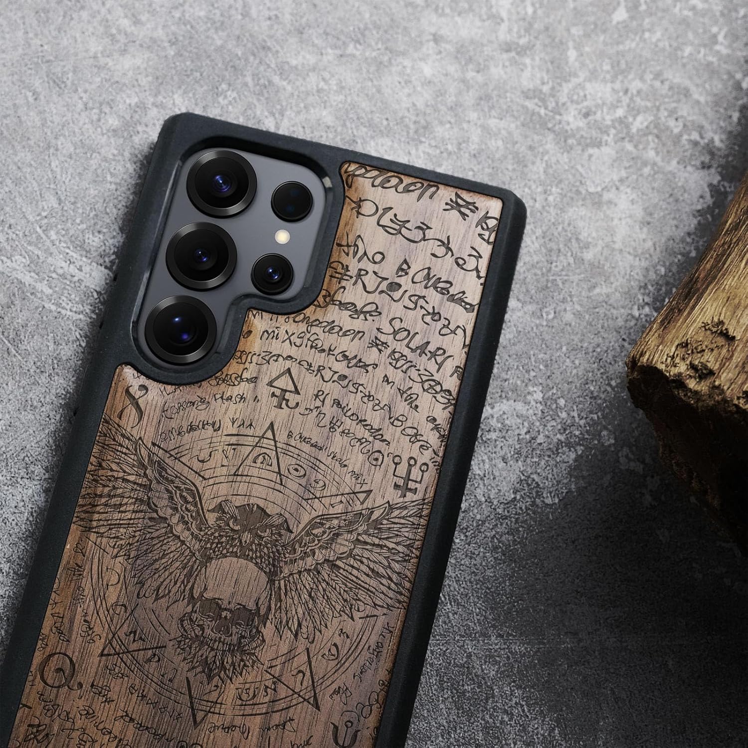 3. Carveit Magnetic Wooden Case for Samsung Galaxy S25 Ultra Case 2025, TPU Shockproof Cover & Wood Artisan Engraved, Compatible with MagSafe Wireless Chargers (Owl and Skull) Walnut