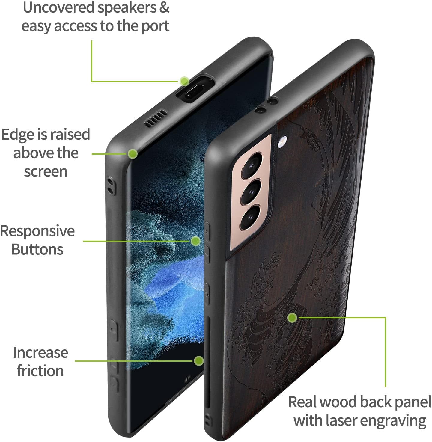 Carveit Wood Case for Galaxy S21 Case [Natural Wood & Soft TPU] Shockproof Protective Cover UniqueWooden Case Compatible with Samsung S21 5G (The Great Wave Off Kanagawa-Blackwood)