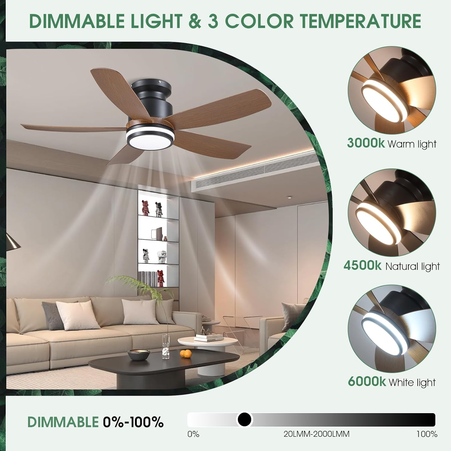 Ceiling Fans with Lights and Remote/APP Control, 41 inch Low Profile Flush Mount Ceiling Fan with Lights, LED Dimmable 5 Reversible Curved Blades 3 CCT 6 Speeds for Bedroom Living Room, Wood