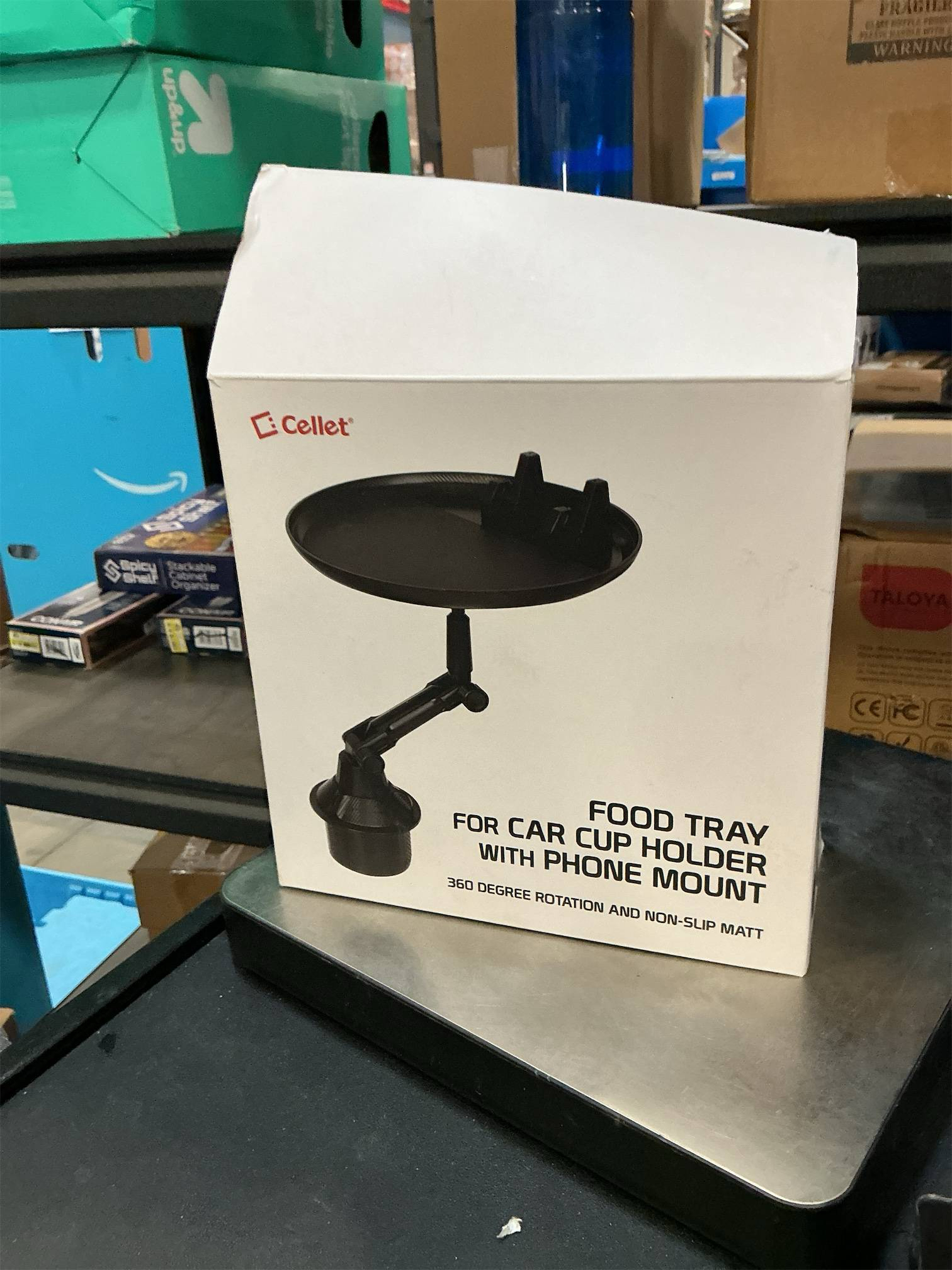 Cellet Cup Holder Tray for Car with Phone Mount – Expandable Base, 360° Rotation Food & Drink Tray with Non-Slip Surface, Adjustable Arm for Eating in Vehicle – Fits Most Standard Car Cup Holders