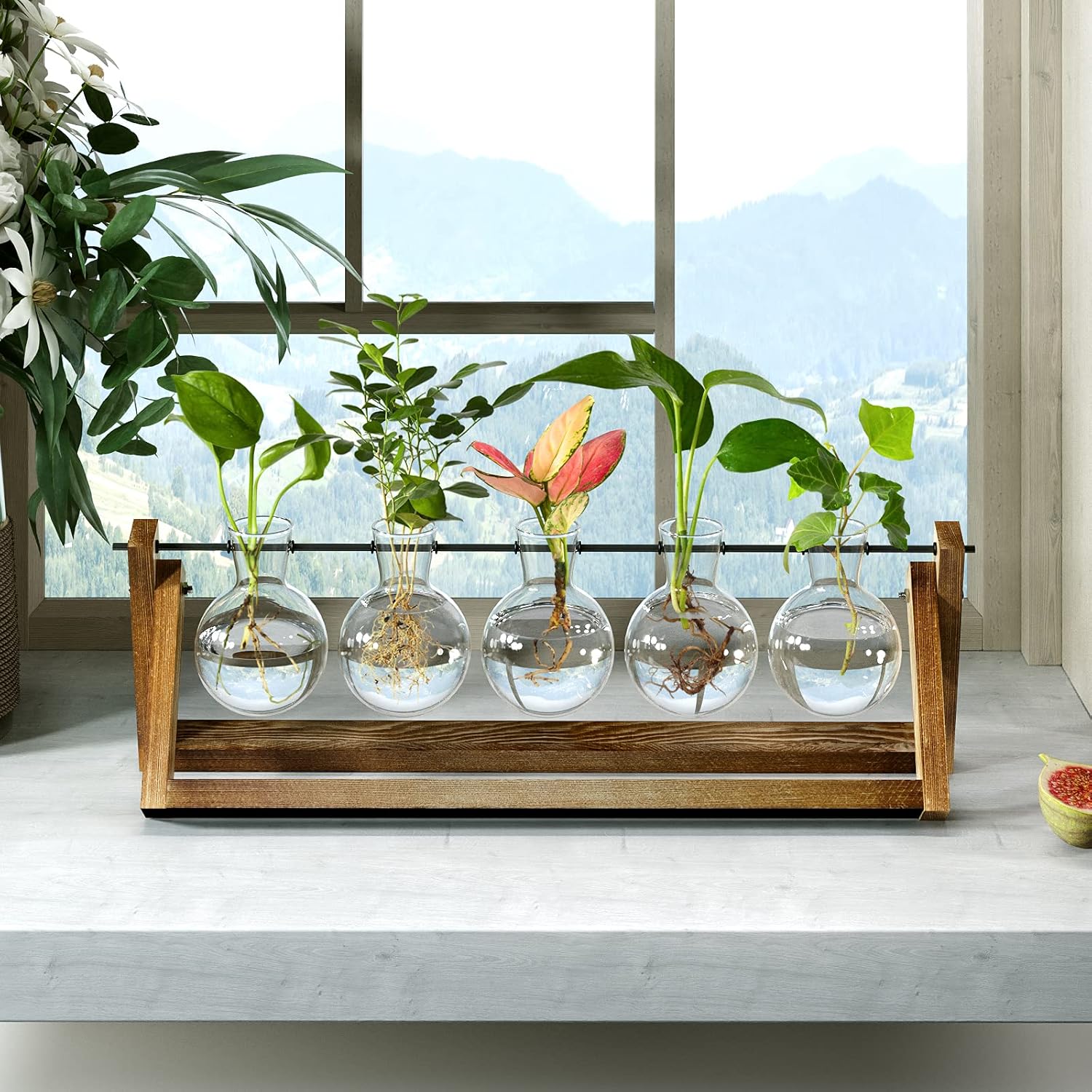 Compact & Retro Design:The propagation vase was composed of five bulb vases and classic wooden frames mainly. You could plant the stemmed plants or some rooting plants, or propagate cuttings. It's great for floral arrangement,home office decoration