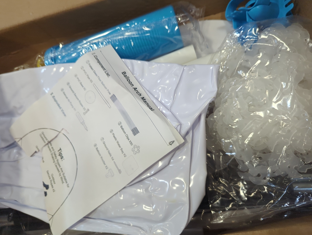 New box damaged【COMPLETE PARTY PACKAGE】: Balloons arch kit package includes 15 folded glass fiber pole, 2 PVC Base, 2 PVC pipe, 2 water(sand) fillable bag, 1 manual pump, 50 balloon clips, 2 balloon knotter, 2 ground secure ropes, 4 ground nails. It will enough for all party decoration you need.