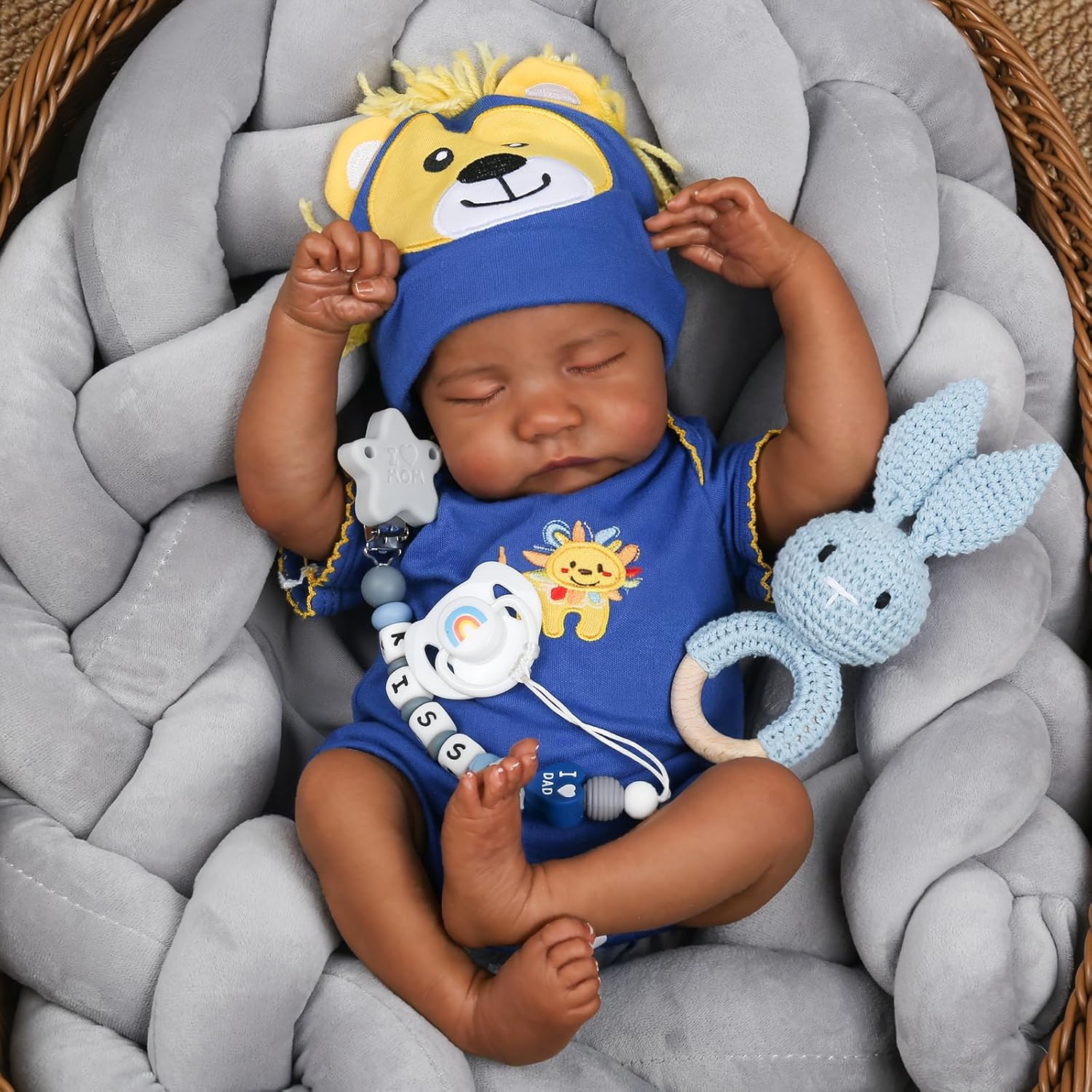 Lifelike African American Reborn Doll - This sleeping baby doll measures 18 inches from head to toe, made with high-quality vinyl and a soft cloth body. The vinyl limbs provide a realistic touch, while the cloth body adds a cuddly and huggable feel, making it ideal for playtime and display