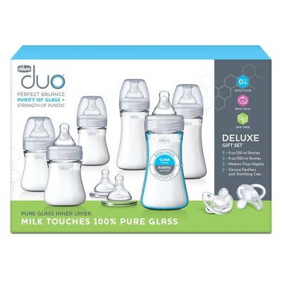 DUO is an anti-colic bottle that uses a breakthrough medical glass technology that permanently bonds a micro-thin layer of unbreakable INVINCI-GLASS to the inside of a premium plastic bottle resulting in the FIRST HYBRID BABY BOTTLE. It features the best of both, the lightweight durability of plastic on the outside and the protective properties of glass on the inside. It won t stain, discolor, retain odor or funky aftertastes. Most importantly, your precious milk touches 100% pure INVINCI-GLASS. It's dishwasher, bottle warmer, and electric sterilizer safe and has minimal parts so you can easily clean your favorite bottle. Award-winning Duo features the exclusive INTUI-LATCH nipple with a 9 out of 10 acceptance rate, breast-like flow, natural feel, and anti-colic valve. Available in single packs, two-packs, and gift sets. Highlights: DUO , the first-of-its-kind hybrid baby bottle, provides the purity of glass and convenience of plastic in one unique bottle. A breakthrough medical glass technology permanently bonds a micro-thin inner layer of INVINCI-GLASS to a premium plastic bottle, making it breakproof yet lightweight. Baby s milk touches pure glass shields milk from plastic. Won t shatter, chip, crack, or flake. Laser etched calibrations & decorations - no ink fading or chipping. No nasty smells or aftertaste. Stays clear won t stain or discolor. Long-lasting, durable and breakproof. Lightweight and comfortable to hold for both parent and baby. Intui-Latch nipple positions baby s tongue and lips for a natural, intuitive latch. Skin-like texture helps baby stay latched. Anti-Colic valve vents air way from nipple to increase feeding comfort. Breast like flow makes it ideal for breast to bottle feeding. Dishwasher, bottle warmer, and electric sterilizer safe. BPA, BPS, PVC & Phthalate-free. Bottles made in the USA. Includes: (3) 5oz + (3) 9oz Duo Bottles with Stage 1 Slow Flow Nipples, (2) Stage 2 Medium Flow Nipples, (2) PhysioForma 0-6m Silicone Orthodontic Pacifiers with sterilizing case. Specifications: Number of Pieces: 10 Dimensions (Overall): 7.09 Inches (H) x 5.69 Inches (W) x 10.75 Inches (D) Weight: 1.5 Pounds Suggested Age: 0-24 Months Features: Nipple Vent, Volume Markings, Wide Neck Bottles Container Material: Plastic Capacity (Volume): 5 fl oz (US) Includes: 2 Level 2 Nipples, 2 Pacifiers, (3) 9 oz. Bottles, (3) 5 oz. Bottles Safety and Security Features: Phthalate-Free, Lead-Free, BPS-Free, PVC-Free, BPA-Free Nipple Level: Level 1 - Slow Flow Industry or Government Certifications: Meets ASTM Standards, Meets CPSC Standards, Meets CPSIA Standards Material: bottle nipple: Silicone Care & Cleaning: Dishwasher-Safe on Top-Rack