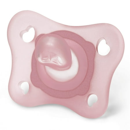 Actively support infant s breathing Clinically developed, tested, and approved in partnership with an advisory panel of leading neonatologists, pediatricians, and orthodontists Mini, extra-soft, satin-textured silicone nipple for more comfort and less slip Ventilation holes for air circulation help prevent the gathering of saliva Lateral curve of the nipple evenly distributes the tongue s pressure against the palate Tiny ridges and inclined nipple shape guide proper tongue placement 15% lighter & 10% smaller than regular Chicco Silicone Pacifiers One-piece construction allows parents to insert finger inside the nipple for extra bonding with the infant Adheres to the guidelines of the American Academy of Pediatrics BPA and LATEX Free Mini has a 95% acceptance rate among newborn infants Included reusable case lets you sterilize pacifiers in 3 minutes Designed and made in Italy Available in one size: 0-2m and two unisex colors: clear and pink