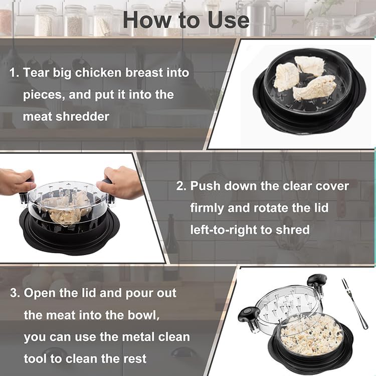【Easy To Use】: Cut the cooked complete chicken breast into three pieces, select one piece and place it on the spike, close the lid. Press to penetrate the flesh and rotate the lid to quickly shred within a few seconds. The hand chicken shredder is also suitable for pork, beef, vegetables, etc.(forbid using raw meat to shred it, as it will damage the spike.)