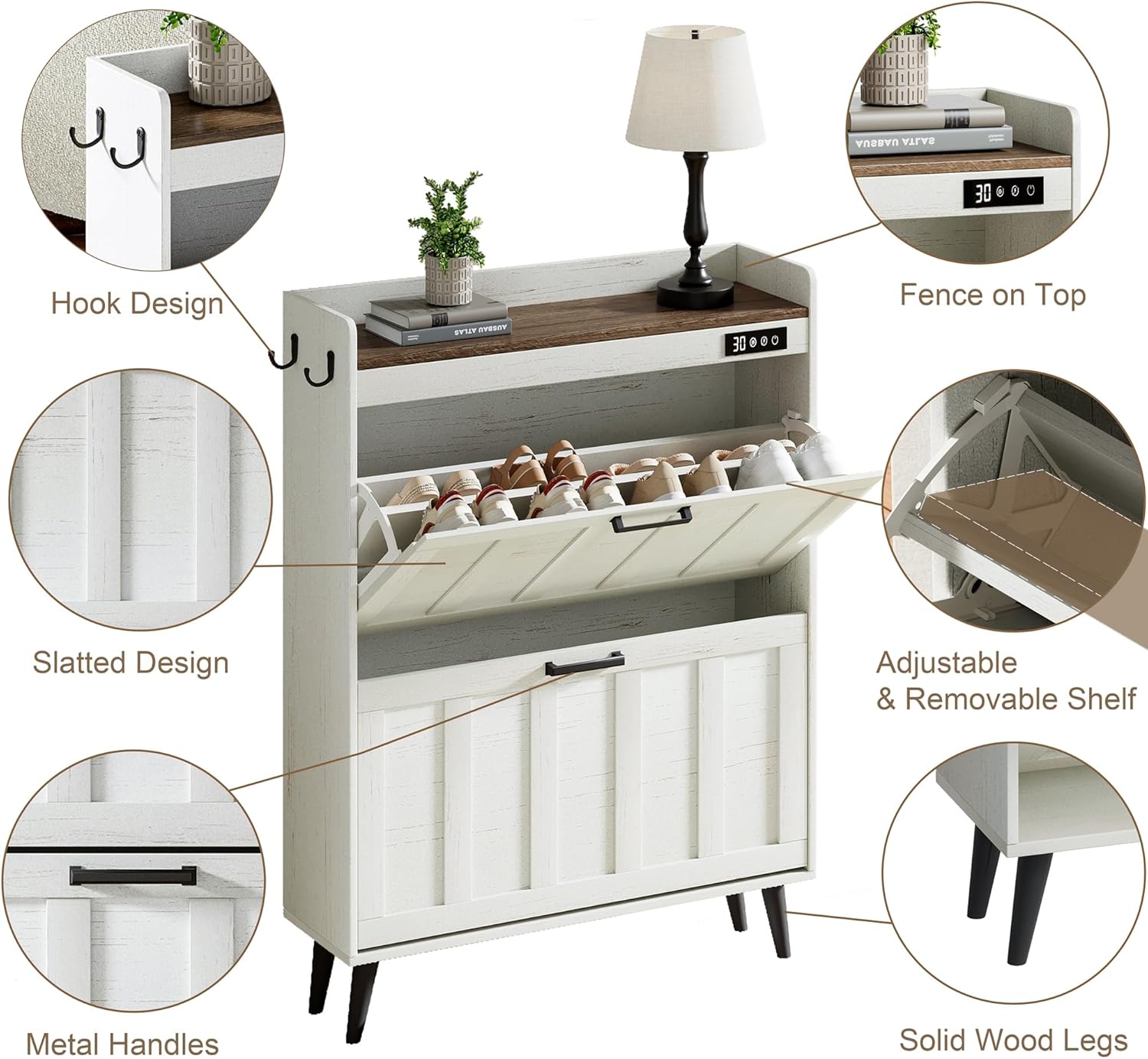 ChooChoo Shoe Storage Cabinet with 2 Flip Drawers, Deodorizing Shoe Organizer Storage for Entryway, Freestanding Hidden Slim Narrow Shoe Rack Cabinet, Antique White & Brown