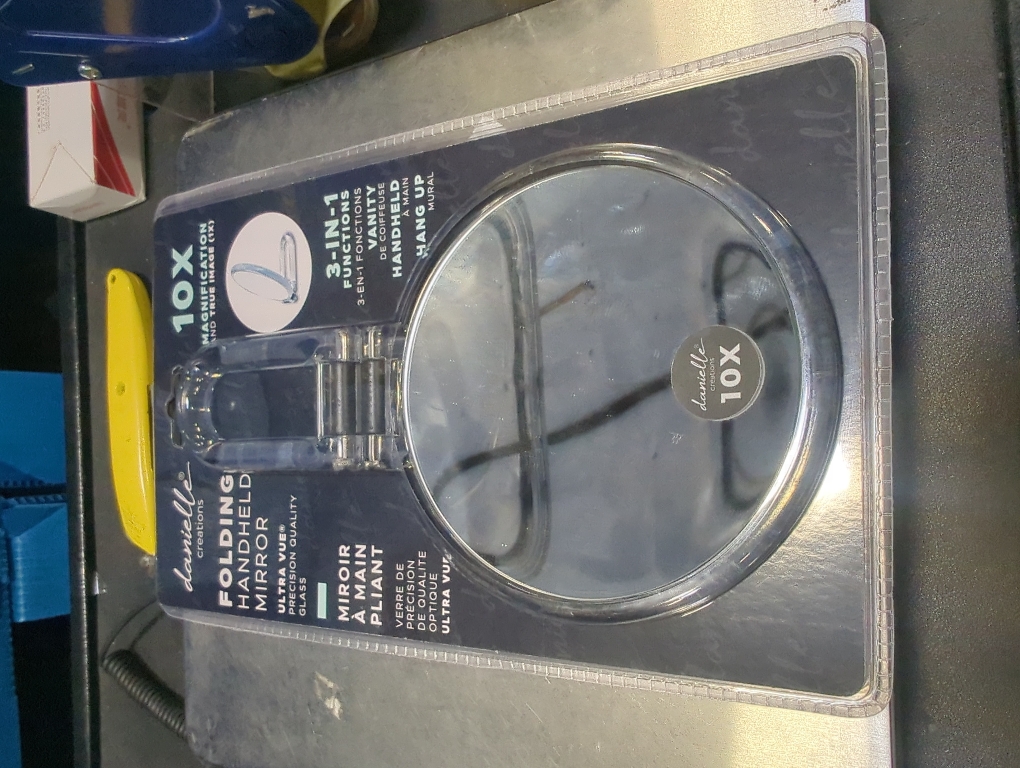This double-sided Folding Hand Mirror features a 10x magnification side and a true image 1x side. Great for your home, office or travel, it is constructed of Ultra Vue optical precision quality glass.