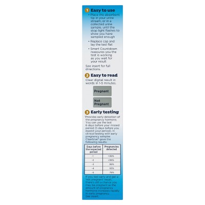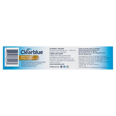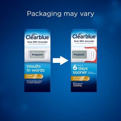 Wondering if you're pregnant? Waiting for your results can be super exciting... and even a little nerve-racking. That's why, if you don't want to wait to test until you miss your period, try the Clearblue Early Digital Pregnancy Test [Clearblue Prueba de Embarazo Digital Temprana] for results up to 6 days early[2].The Clearblue Early Digital Pregnancy Test is our most sensitive digital home pregnancy test[4], delivering results up to 6 days before you miss your period[2]. Once the test is running, the Smart Countdown will appear on screen to reassure you the test is progressing, counting down to your clear digital result in words, within just 1-5 minutes. Each pack includes 2 individually wrapped digital pregnancy tests that detect the "pregnancy hormone" (hCG), which starts showing up in your urine shortly after implantation. This early pregnancy test is easy to grip and has an extra-wide tip for easy urine sampling. Plus, it features a digital display that gives clear results ("Pregnant" or "Not Pregnant"). Over 99% accurate[1], you can feel confident in your results.[1] Over 99% accurate from the day you expect your period. >99% accurate at detecting typical pregnancy hormone levels. Note that hormone levels vary. See insert. [2] 78% of pregnant results can be detected 6 days before your missed period.[3] Test sensitivity is 10mIU/ml.[4] vs. other Clearblue digital tests